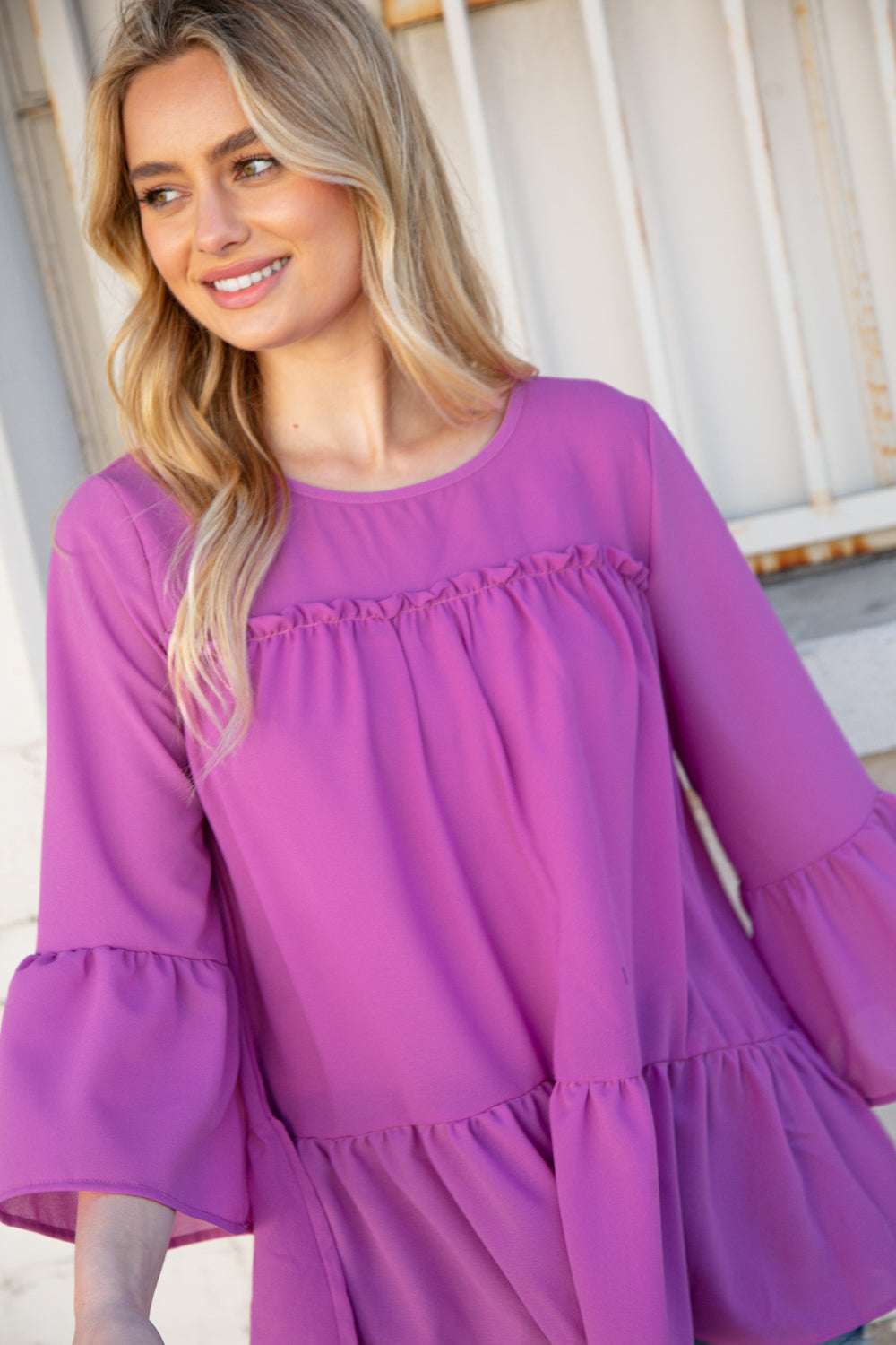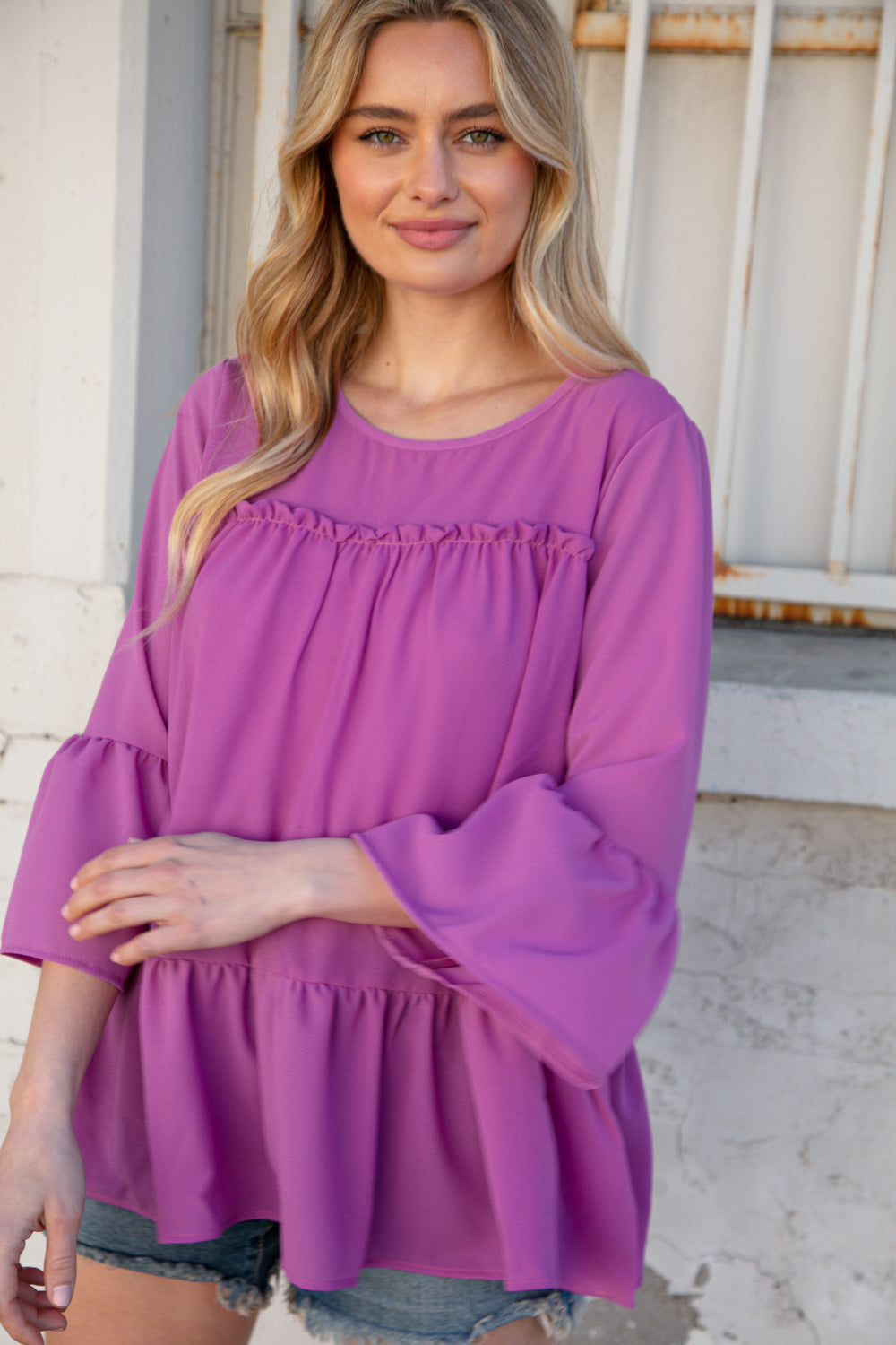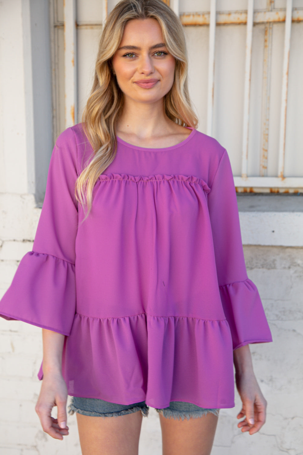 Introducing the Orchid Round Neck Frill Detail Crepe Blouse, a stunning addition to your wardrobe that combines elegance and comfort. This blouse is perfect for various occasions, especially date nights, where you want to make a lasting impression. The romantic design features a round neck and charming three-quarter bell sleeves, making it a versatile piece that can be dressed up or down.