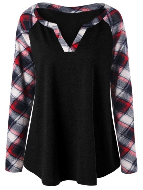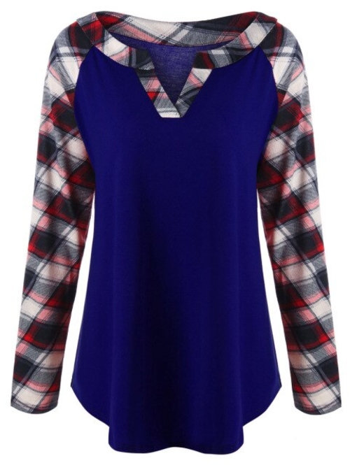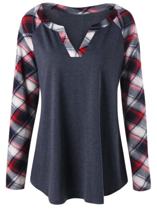 Plaid Printed Patchwork Lady T Shirt Autumn