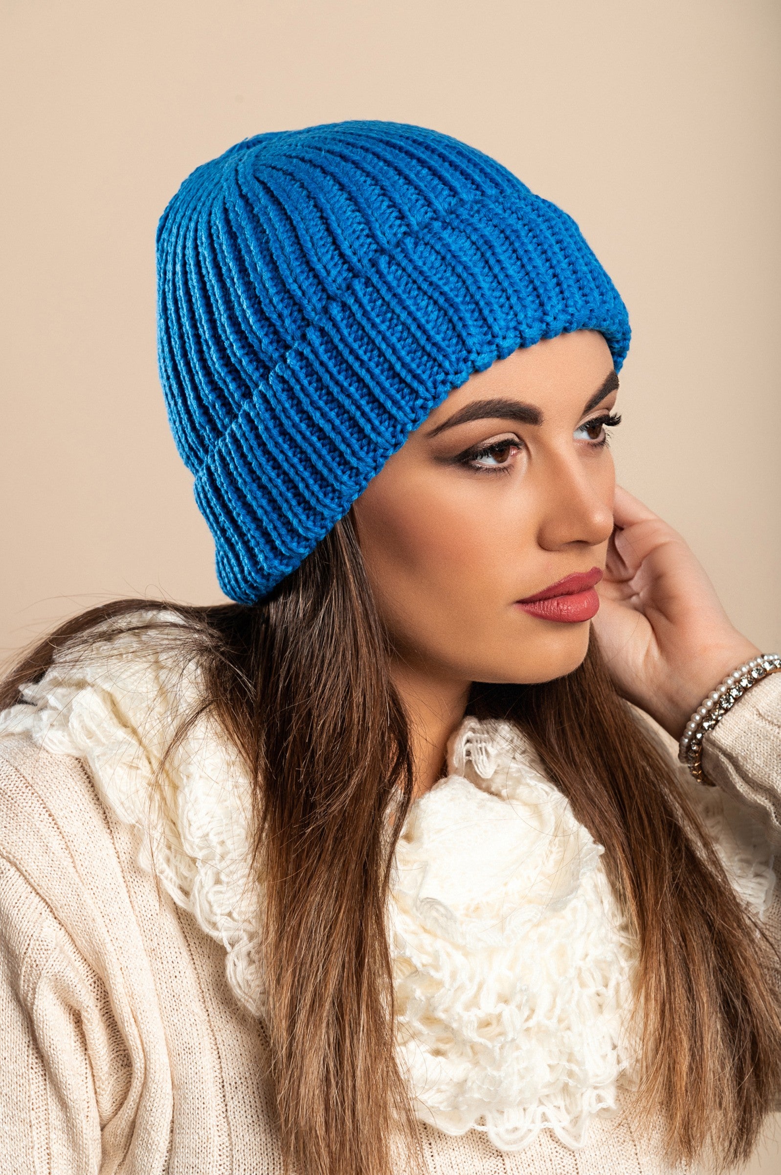 Ta pletena kapa ni le funkcionalna, ampak tudi izjemno modna. Njena kraljevsko modra barva je odlična izbira za tiste, ki želijo dodati malo barve svoji zimski garderobi. Rebrasto pletena zasnova dodaja teksturo in zanimivost, medtem ko zavihan rob prinaša dodatno eleganco in stil.