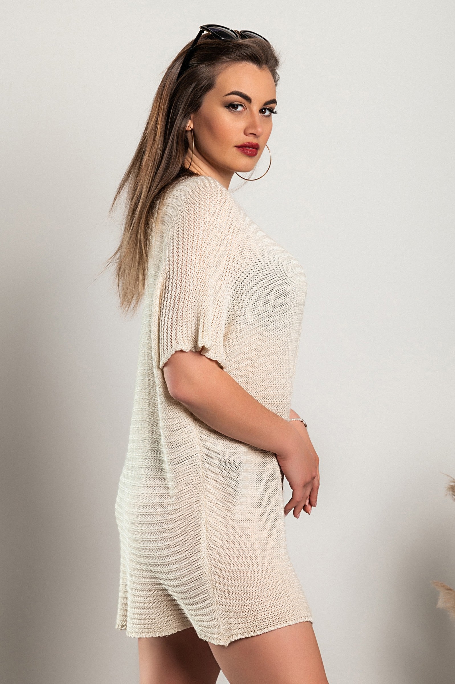 Odkrijte našo pleteno mini obleko s kratkimi rokavi v čudoviti kremni barvi, ki je popolna izbira za vsako priložnost. Ta obleka je izdelana iz lahkega blaga visoke kakovosti, kar zagotavlja udobje in prijetno nošenje skozi ves dan. Ohlapen kroj omogoča svobodo gibanja, kar je še posebej pomembno v toplejših mesecih.