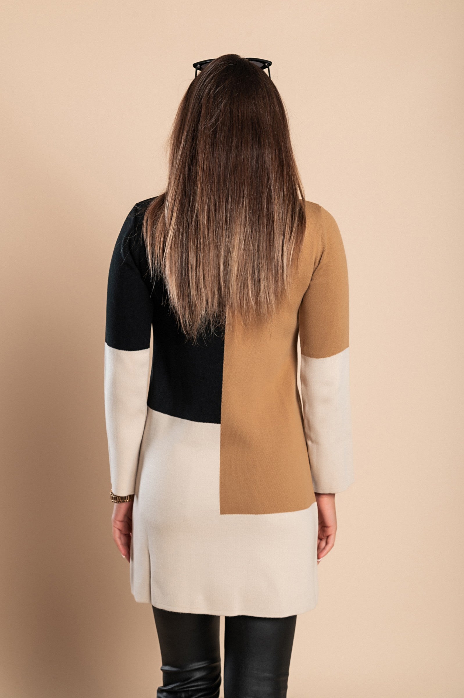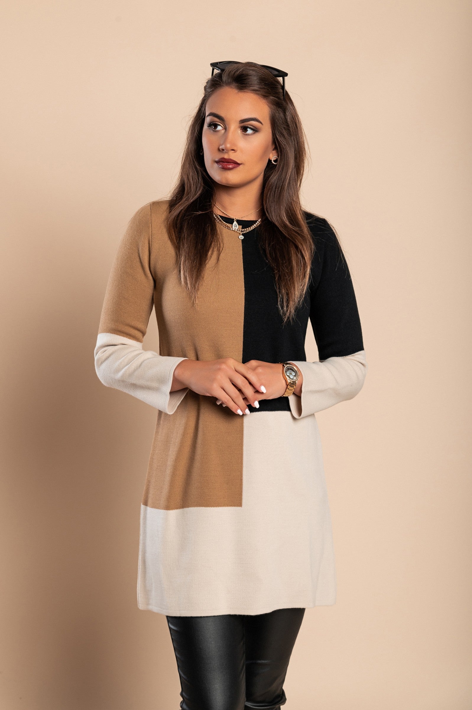 Tribarvna kombinacija obleke prinaša svežino in edinstvenost, ki jo lahko enostavno kombinirate z različnimi dodatki. Ne glede na to, ali jo nosite na poslovnem srečanju, večernem izhodu ali priložnostnem druženju, bo ta obleka zagotovo pritegnila pozornost. Dolgi rokavi in okrogel ovratnik dodajajo klasičen pridih, ki je vedno v modi.