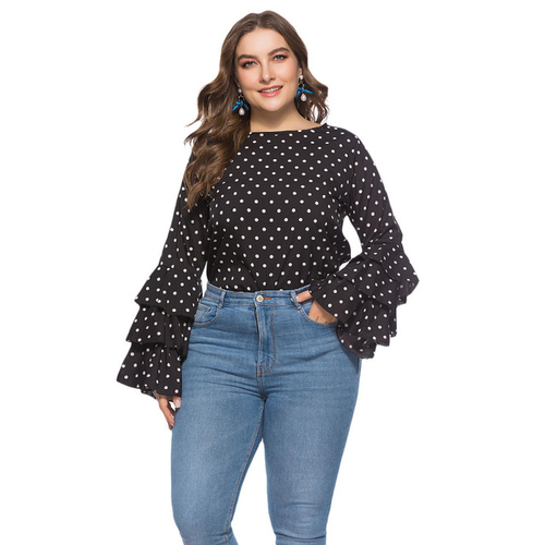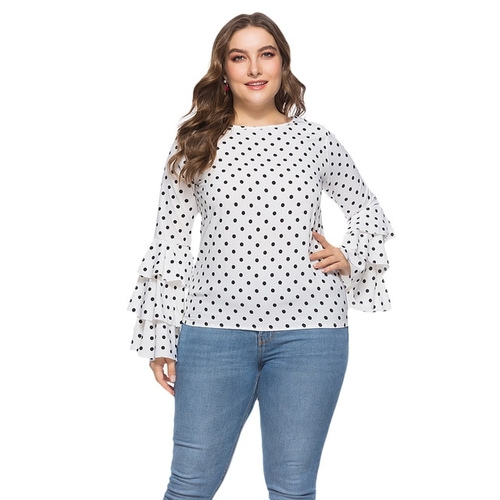 Gender: Women Material: Polyester Clothing Length: REGULAR Style: Casual Fabric Type: Broadcloth Sleeve Length(cm): Full Decoration: NONE Pattern Type: Polka Dot Collar: O-Neck Sleeve Style: Flare Sleeve Model Number: Women Blouses 20180711