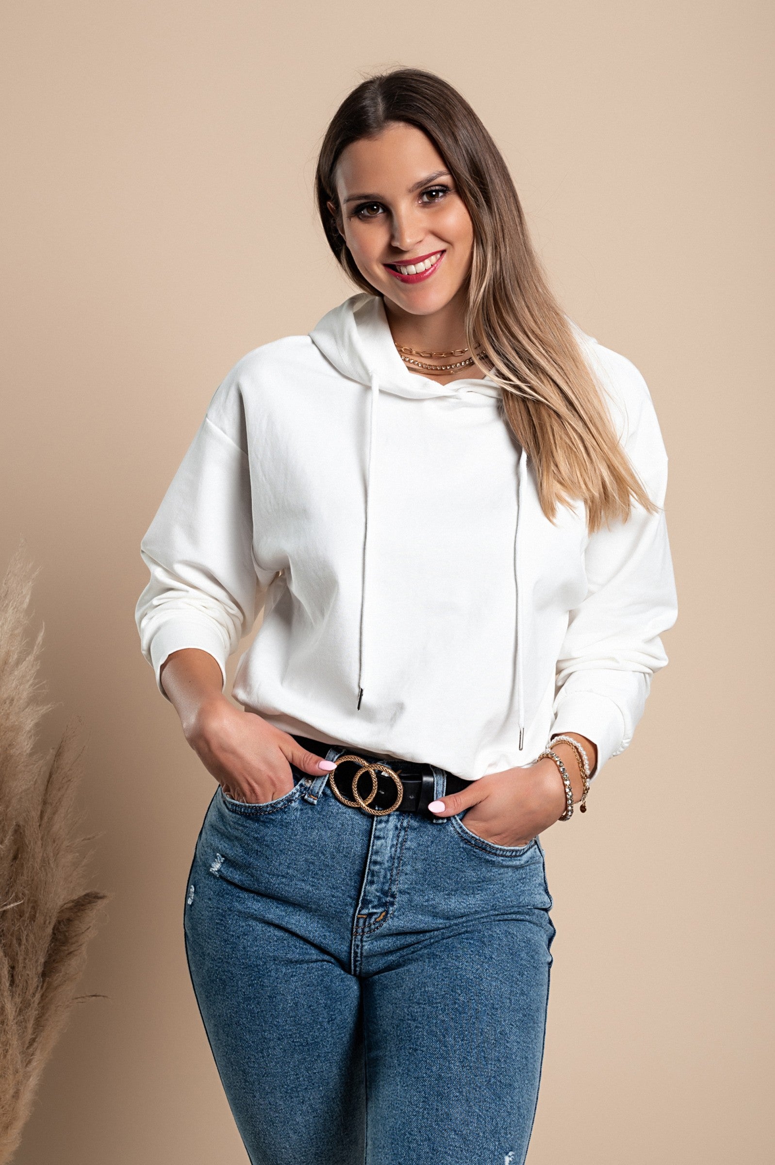 Športna majica s kapuco Rionna v beli barvi je idealna izbira za vse, ki iščejo udobje in stil v enem. Narejena iz mešanice bombaža, poliestra in elastana, ta majica zagotavlja popolno udobje pri nošenju, kar jo dela primerno za vsakodnevne aktivnosti, športne dejavnosti ali sproščene trenutke s prijatelji.