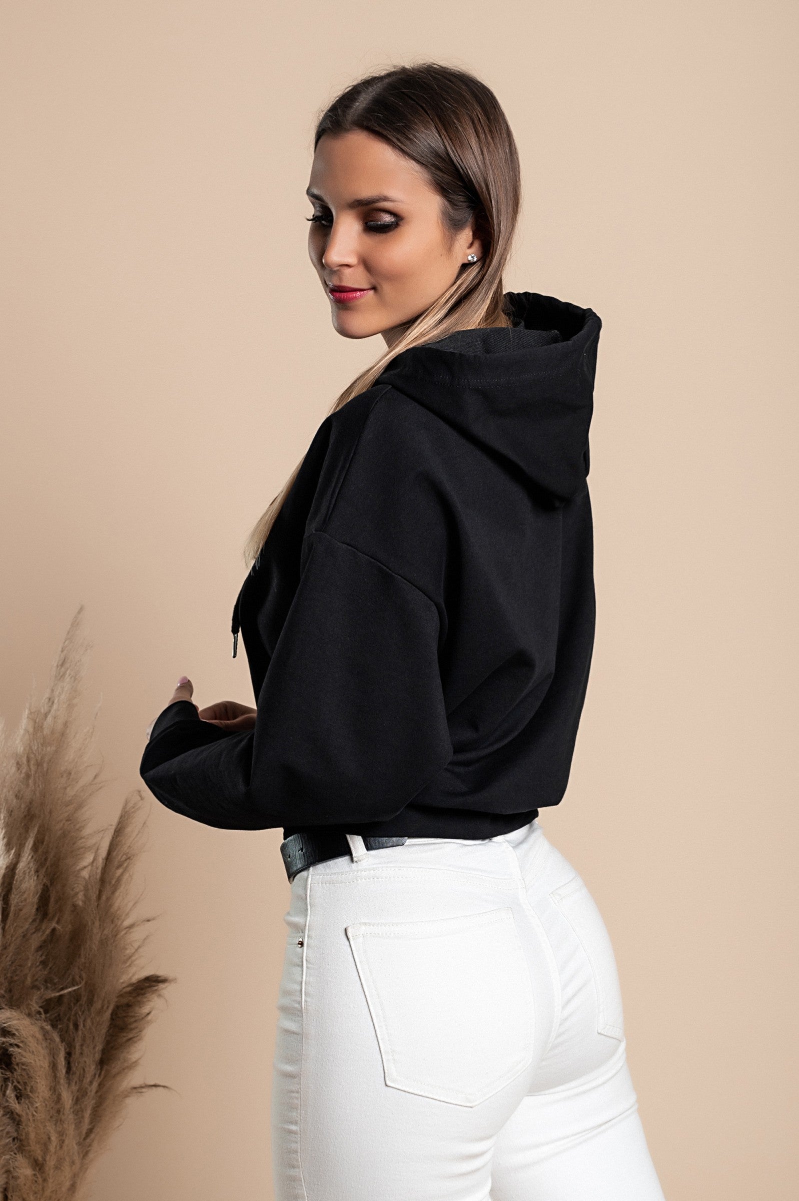 Športna majica s kapuco Rionna je primerna za različne modne kombinacije. Lahko jo nosite s športnimi hlačami za aktivne dni ali pa jo kombinirate z jeans hlačami za sproščen videz. Črna barva je vsestranska in se enostavno ujema z drugimi barvami, kar vam omogoča, da ustvarite različne stilske kombinacije.