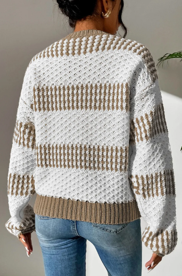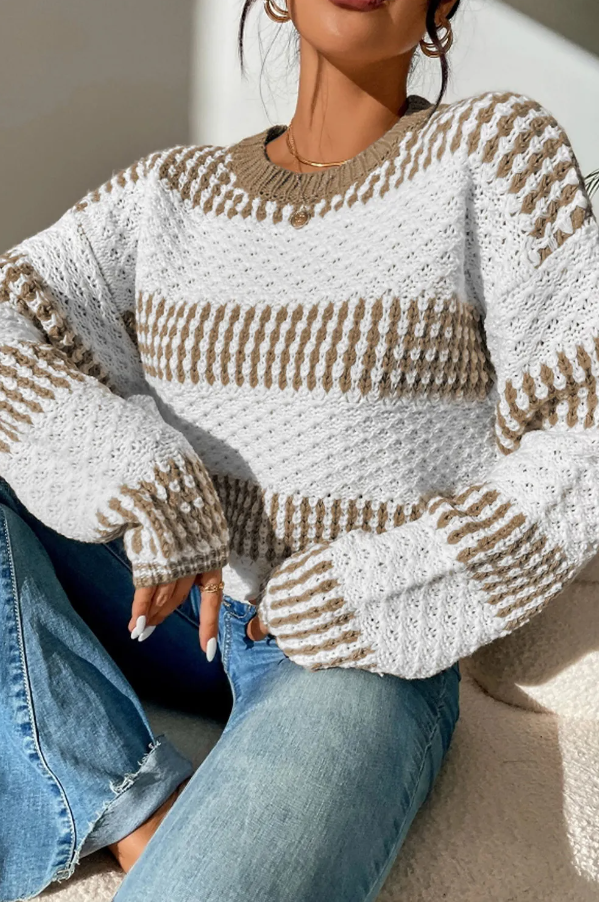 Večbarvni pulover v dvobarvni kombinaciji z dolgimi rokavi in okroglim ovratnikom, izdelan iz mehkega akrila.