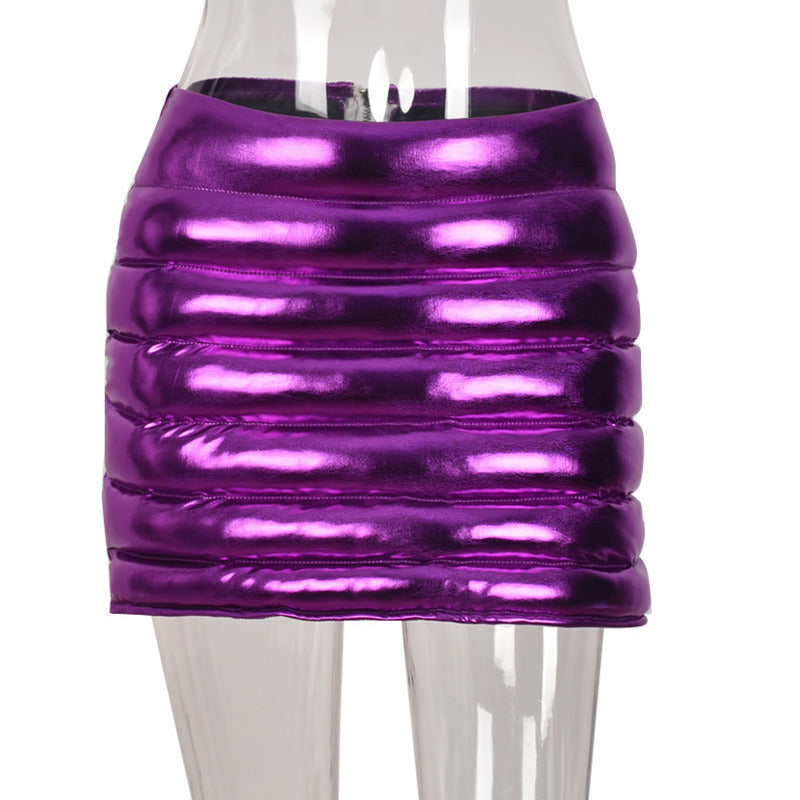 The unique quilted design of the Purple Women's Puffer Skirt adds a touch of elegance to your outfit. Its metallic finish catches the light beautifully, making it a standout piece for any occasion. Whether you're heading to a party, a night out, or just running errands, this skirt will elevate your look effortlessly.