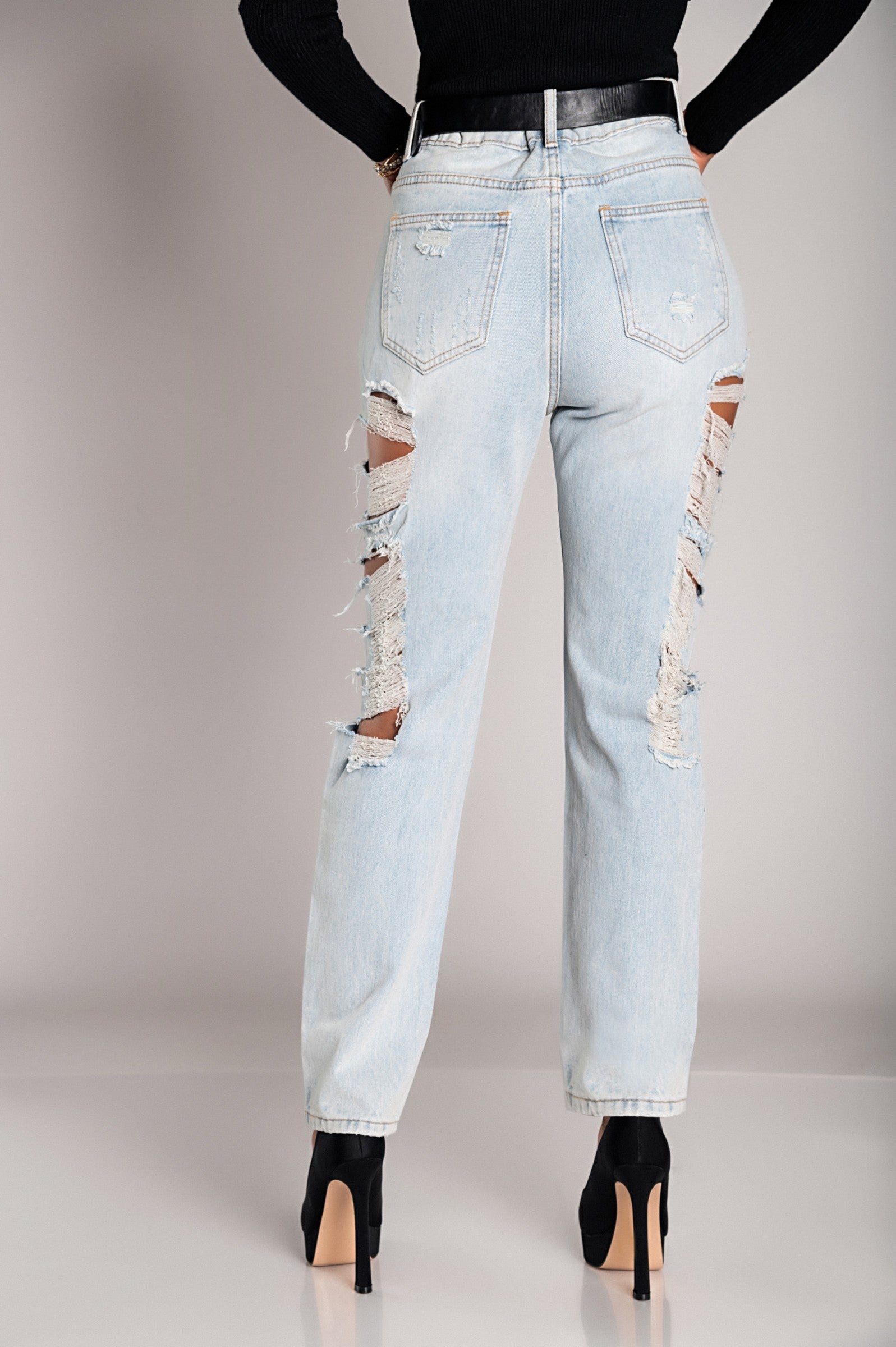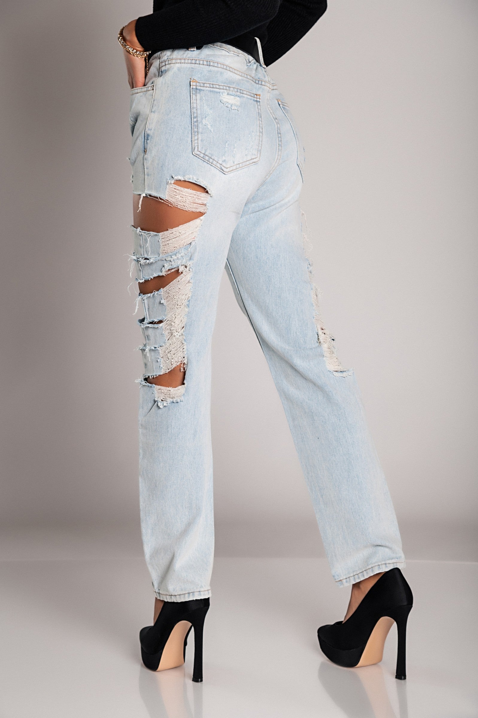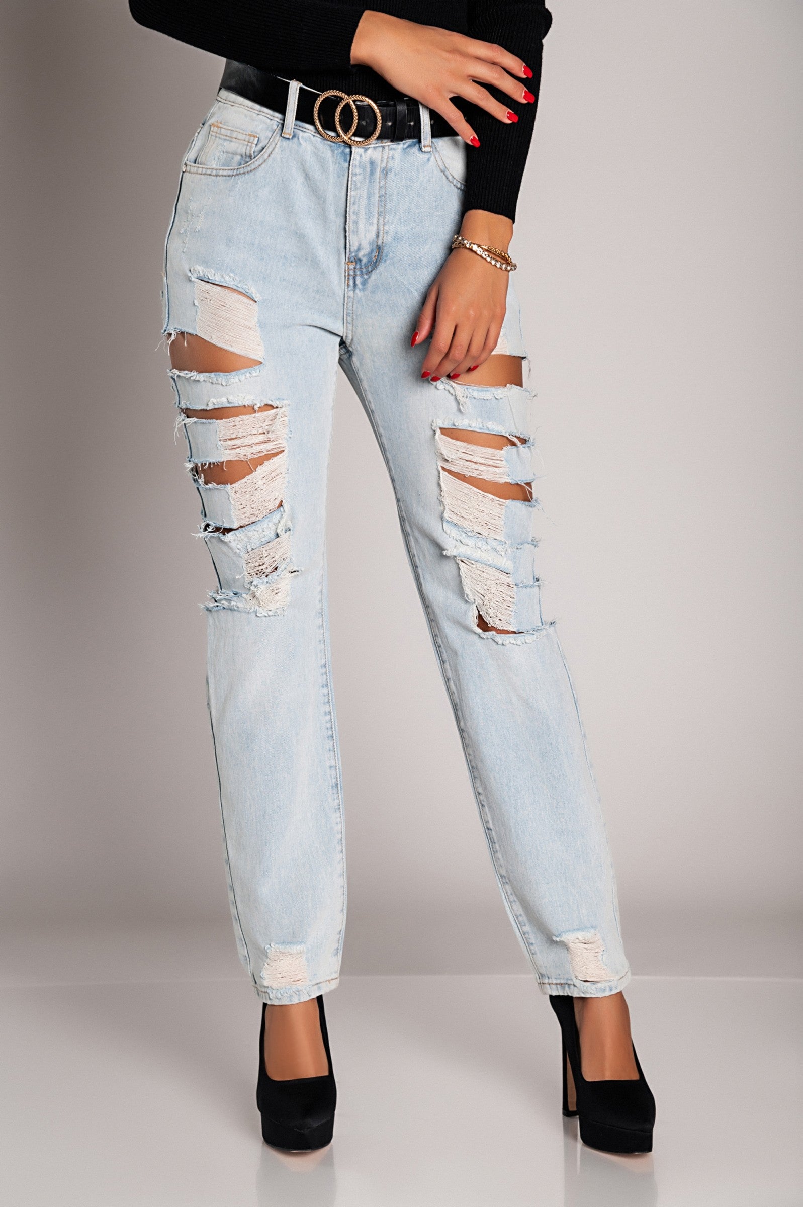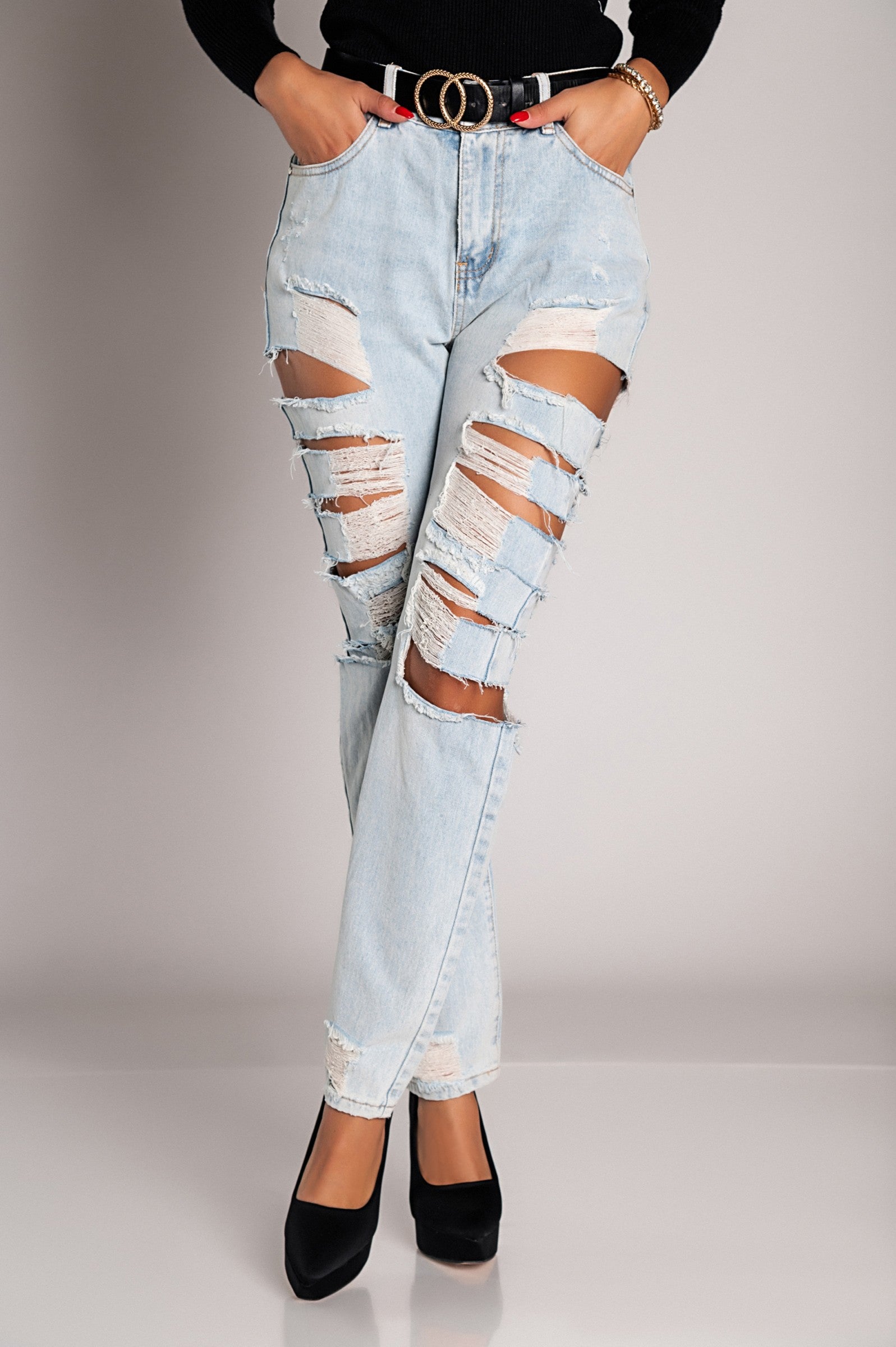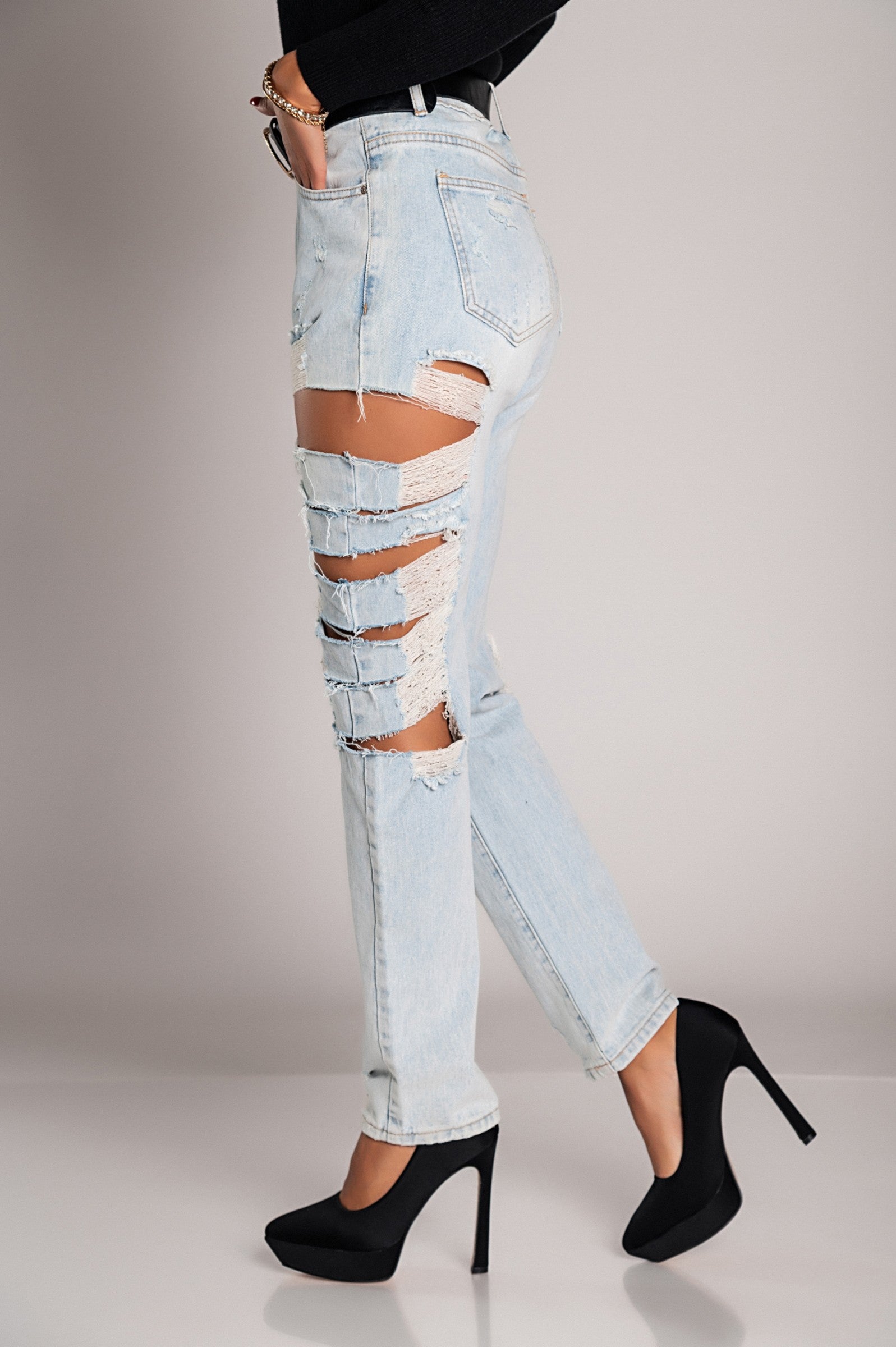 Svetlo modre ravne kavbojke z velikimi razporki na sprednji strani, zapiranje z gumbom in zadrgo, žepi spredaj in zadaj.