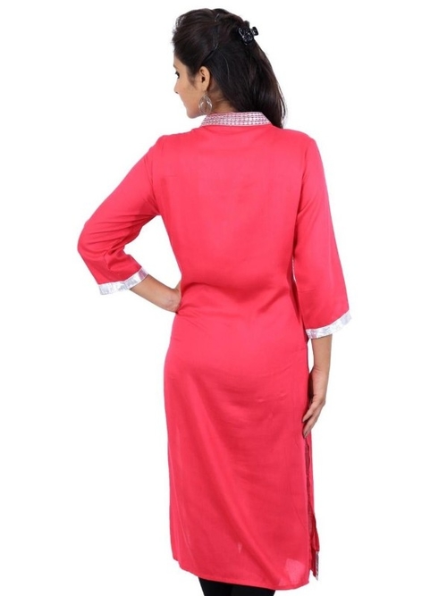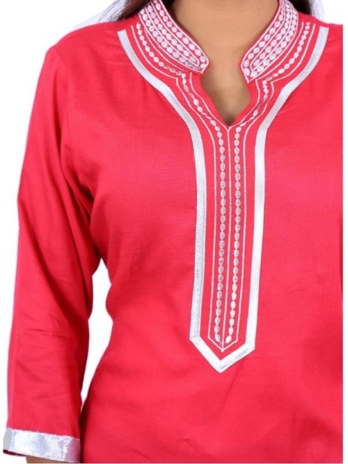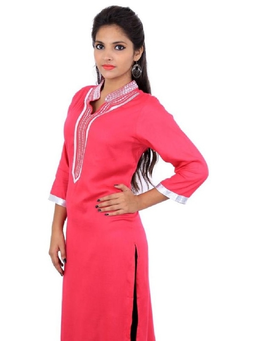 3/4 Sleeve, Standing Collar party wear kurti with zari thread embroidery, Interlocking-same thread, Bottom Fold Single Stitching.