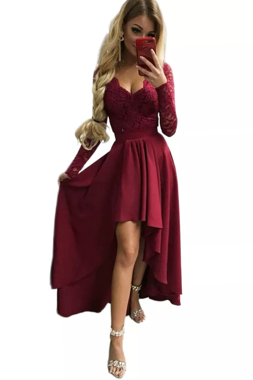 Dropship Red V-neck Lace Backless High and Low Hem Evening Dress