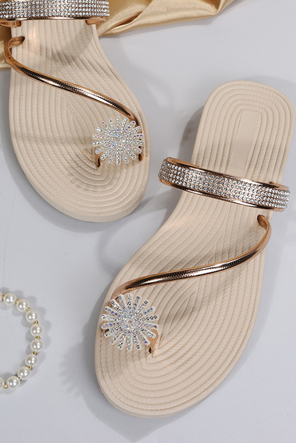 Stylish gold rhinestone sandals with flat soles and decorative straps, perfect for summer wear.
