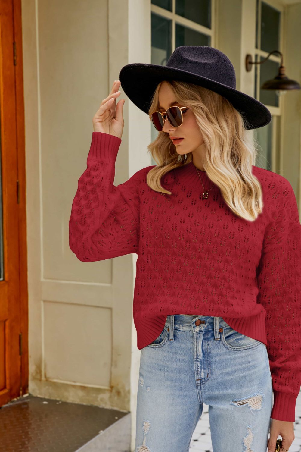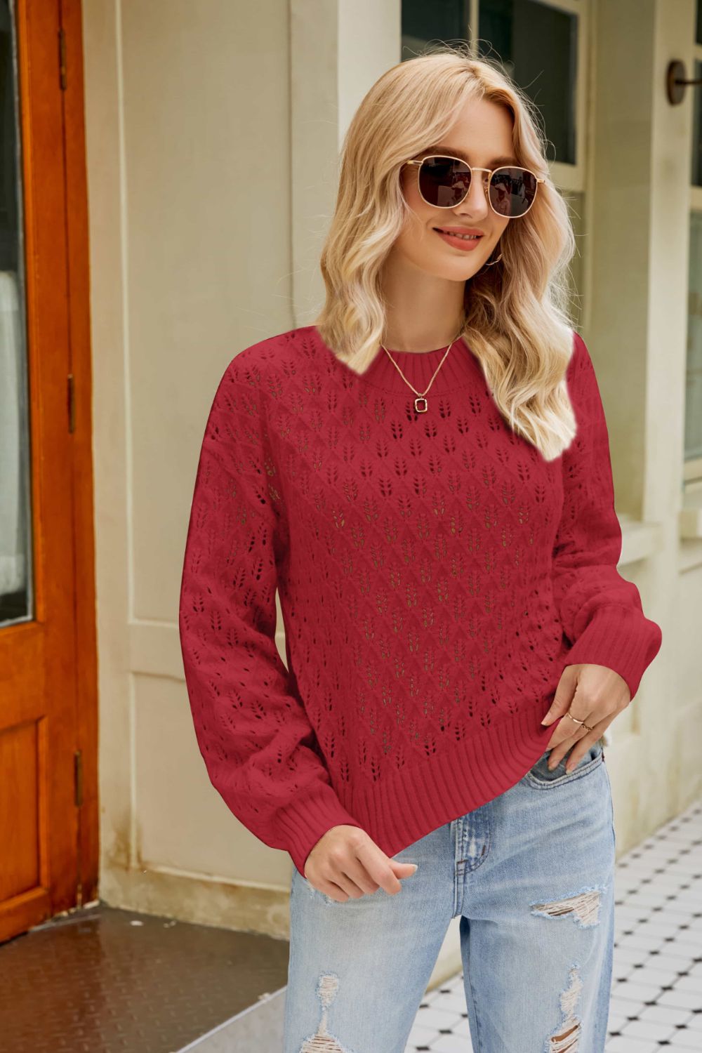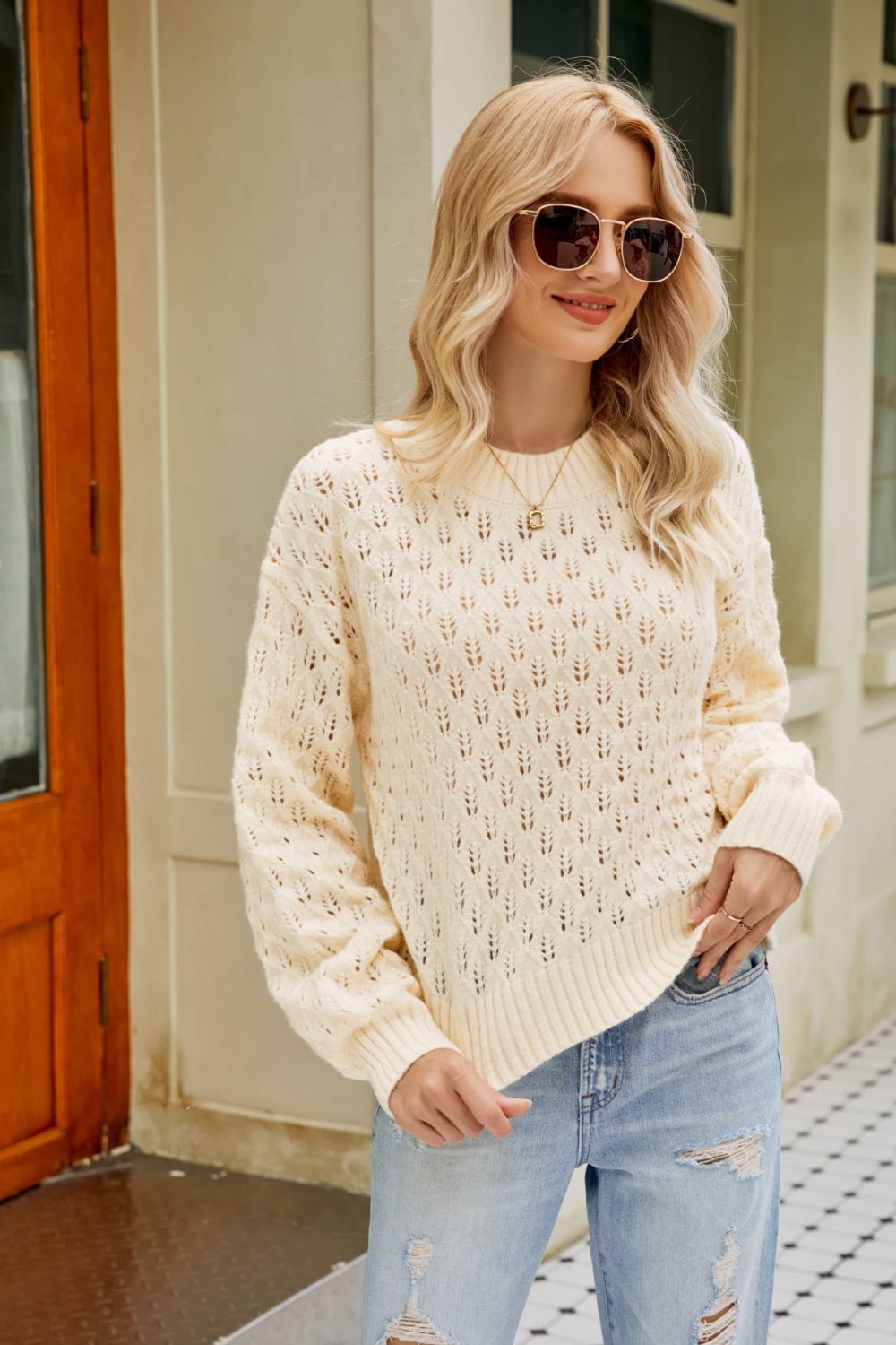 Ribbed Trim Openwork Crewneck Sweater in a studio setting, showcasing its stylish design and comfortable fit.