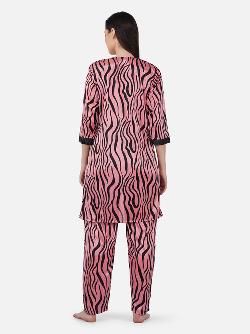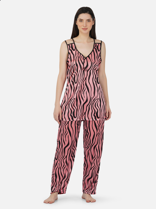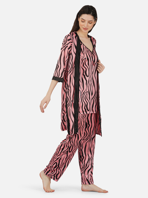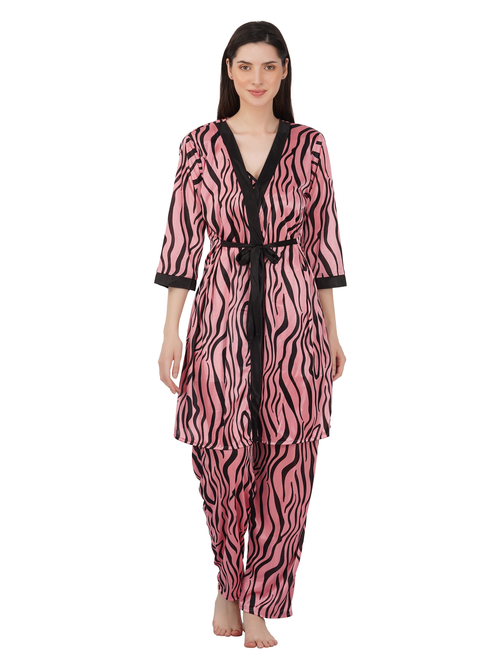Romaisa Women's Satin Pink Maroon Top and Pyjama with Robe