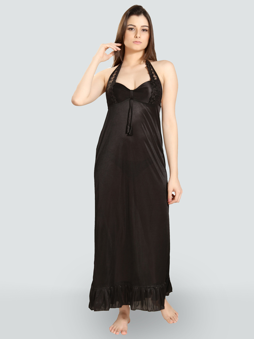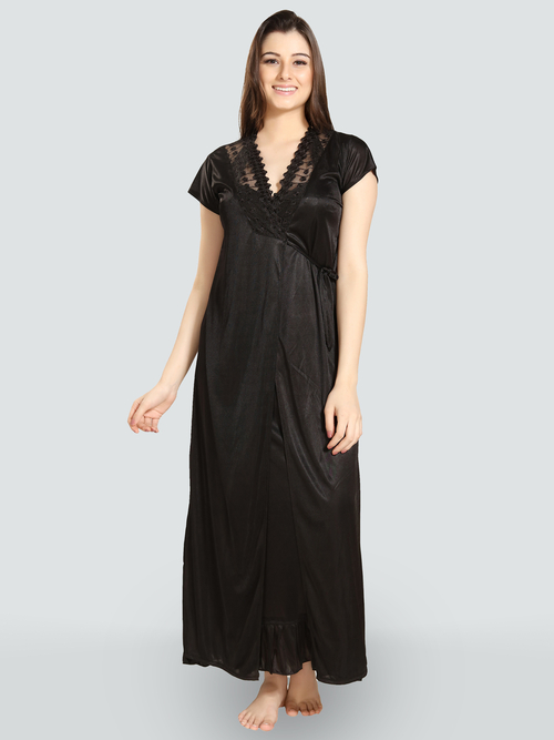 Dropship Romaisa Women's Satin Solid Black Maxi Length Nighty with Robe