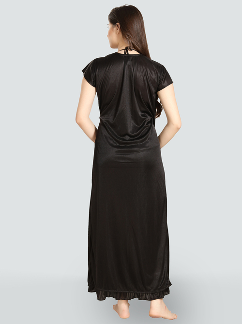 Romaisa Women's Satin Solid Black Maxi Length Nighty with Robe