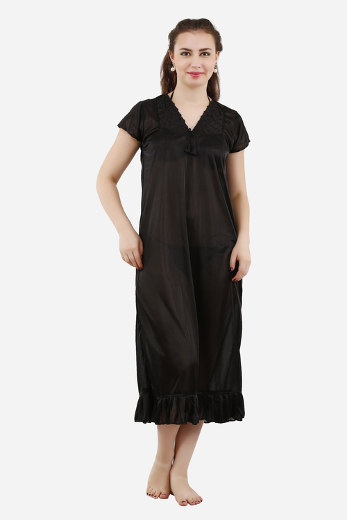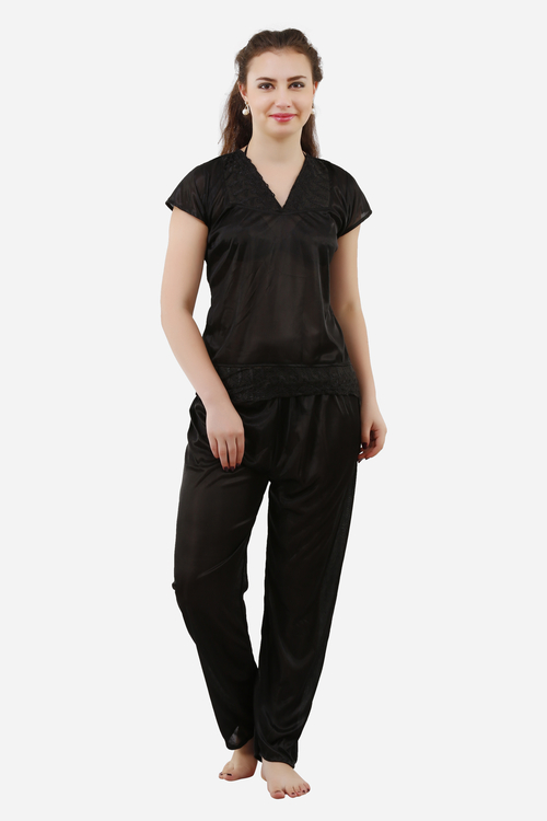Romaisa Women's Satin Solid Black Nightwear Set ( Pack of 6 )