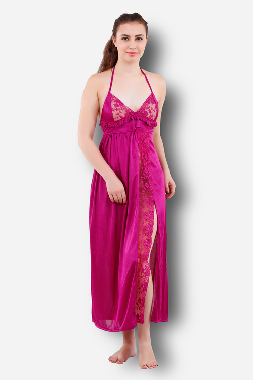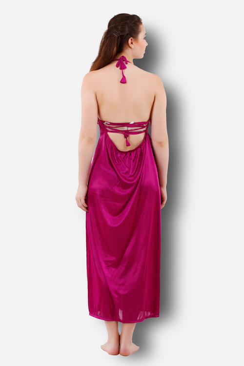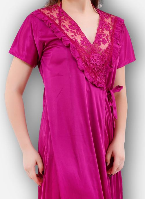 Romaisa Women's Satin Solid Magenta Maxi Length Nighty with Robe