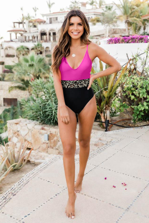 •Colorblock and leopard print splicing in a low cut neck one-piece