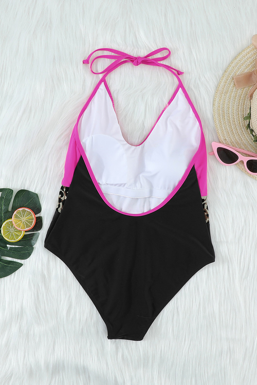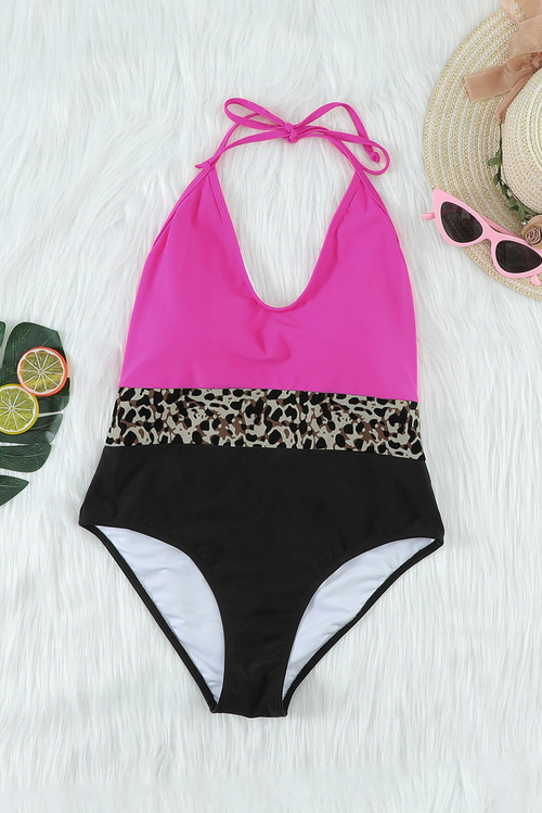 Rose Splicing Leopard Print Color Block One Piece Swimsuit