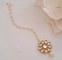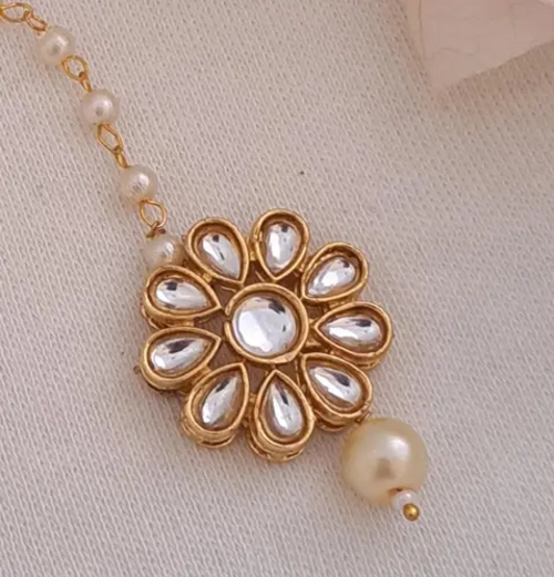 This beautifully crafted accessory is a true celebration of elegance and tradition. Made with the finest Kundan stones and delicate pearls, it exudes timeless charm and grace. Adorn your forehead with this maangtikka and experience the enchantment it brings to your look. The Kundan stones, known for their lustrous appeal, are intricately arranged in a captivating design, while the pearls add a touch of sophistication. The combination of these elements creates a stunning piece that effortlessly enhances your beauty.