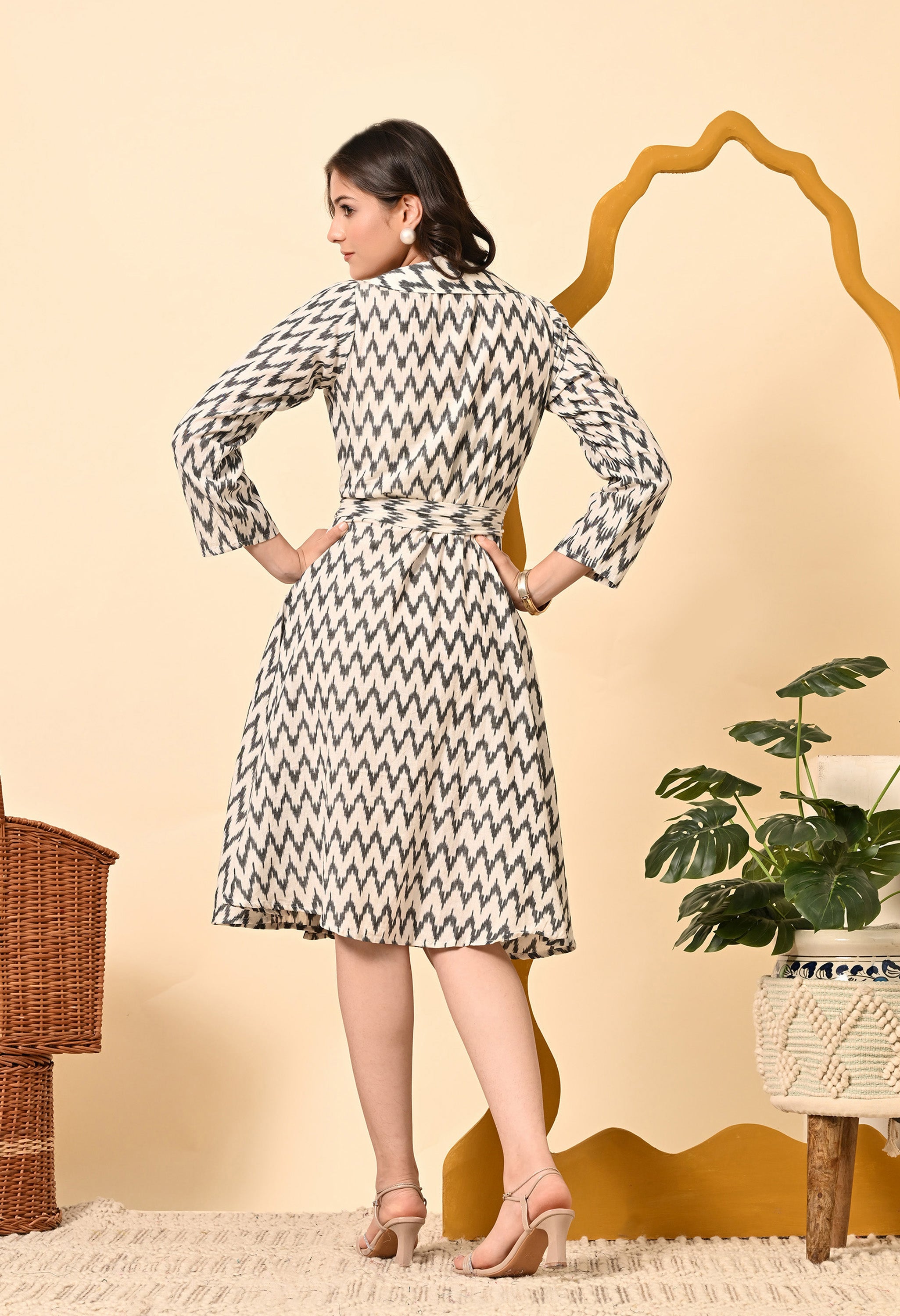 Crafted from high-quality handloom IKAT fabric, the ROYALE I showcases a unique zig-zag pattern that adds a touch of sophistication to your outfit. The coat features a wrap-over fastening at the front, allowing for easy wear and a secure fit. The full sleeves and lapel collar enhance its classic appeal, making it suitable for various occasions.