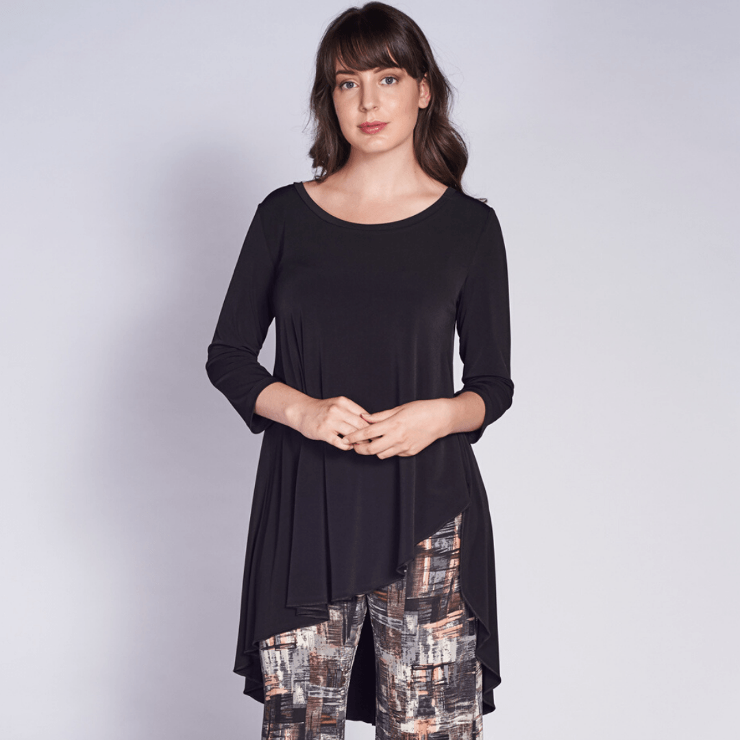 The tunic's curve-accentuating left bodice creates a beautifully draped angle hem, adding an edgy silhouette that allows you to express your personal style. The sleek lines and modern cut make it easy to pair with your favorite jeans, leggings, or skirts, giving you endless styling options. Whether you prefer a laid-back look or something more polished, the Santa Monica Tunic adapts to your vision effortlessly.