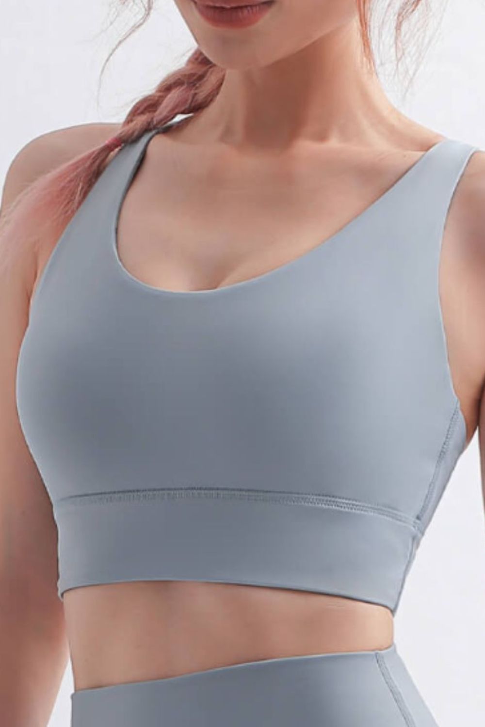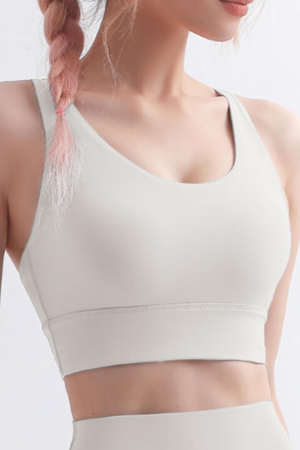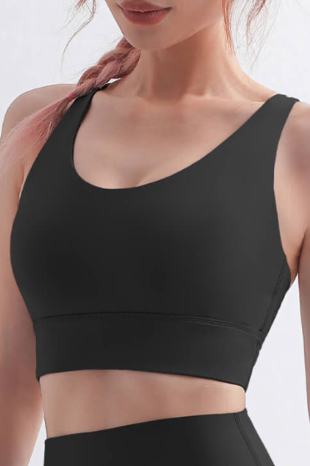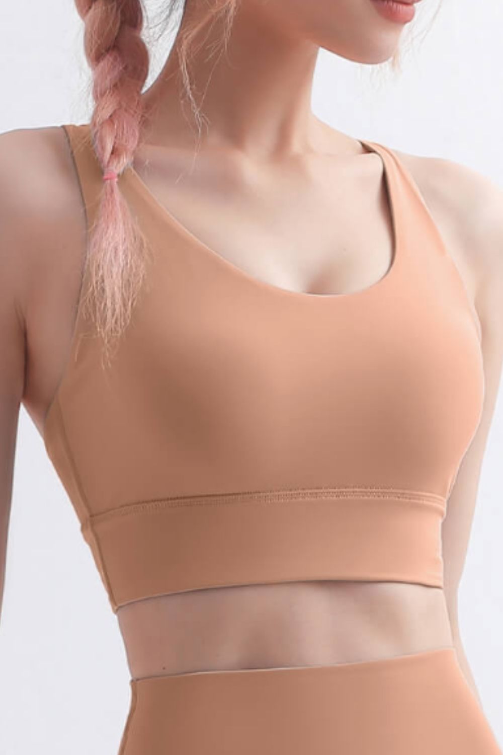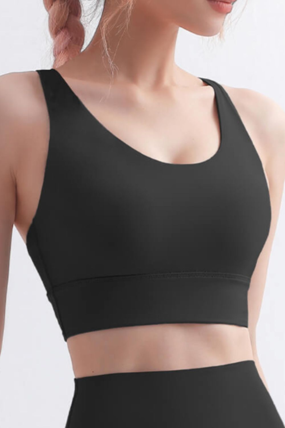 Scoop Neck Crisscross Back Sports Bra in solid color, showcasing its stylish design and comfortable fit, perfect for yoga and workouts.