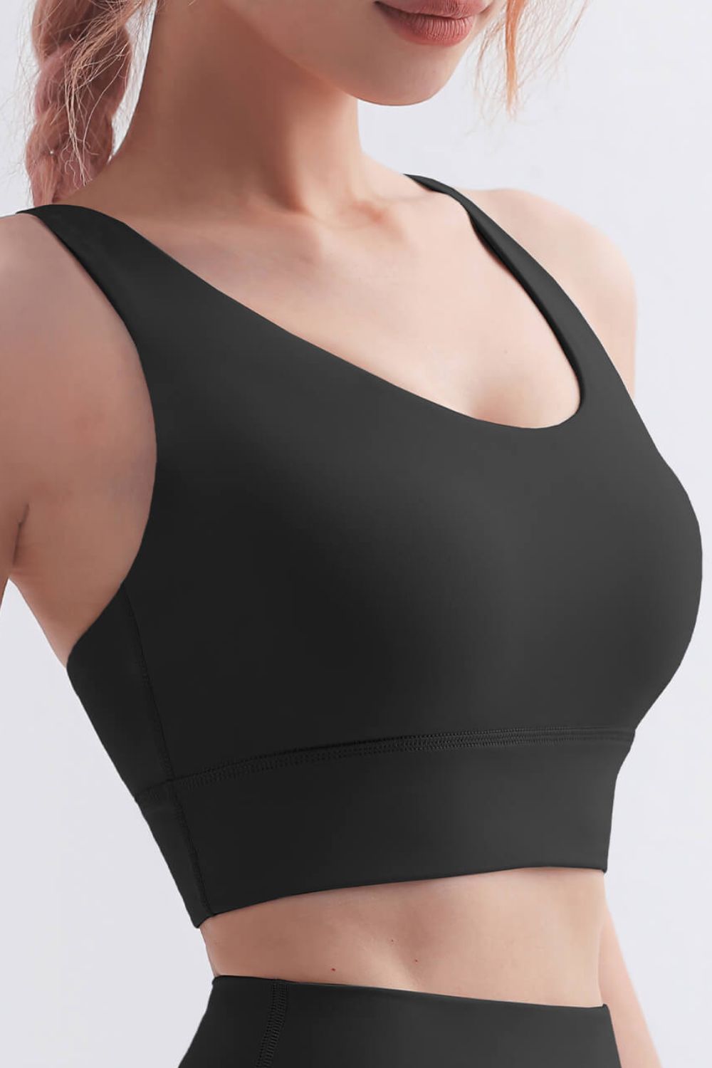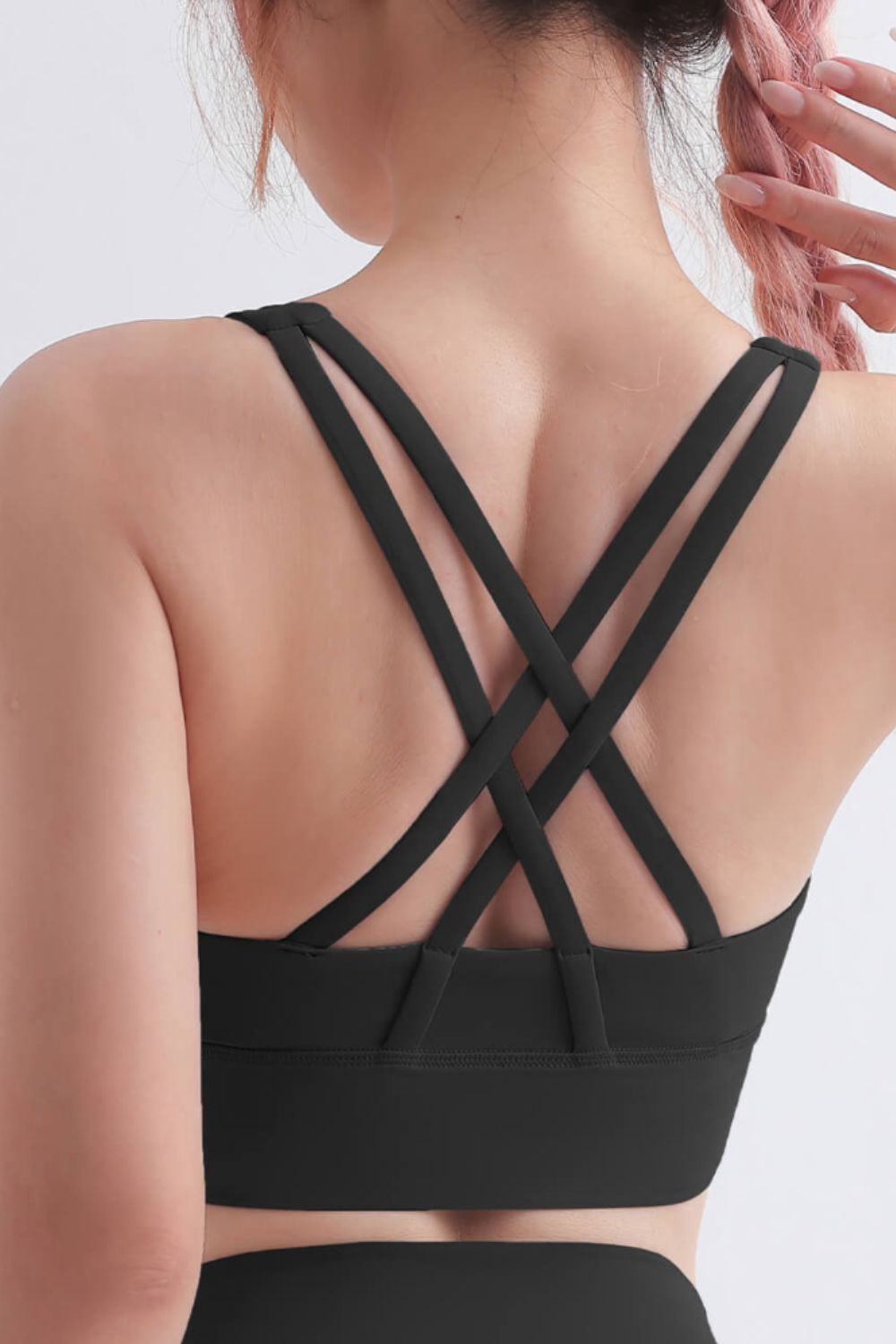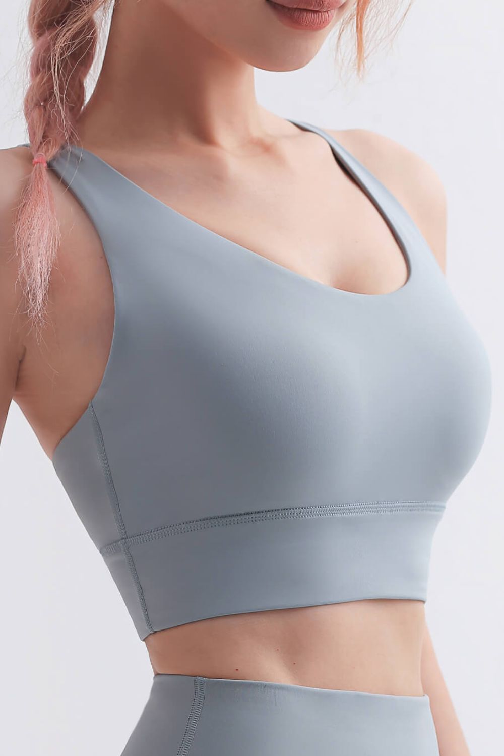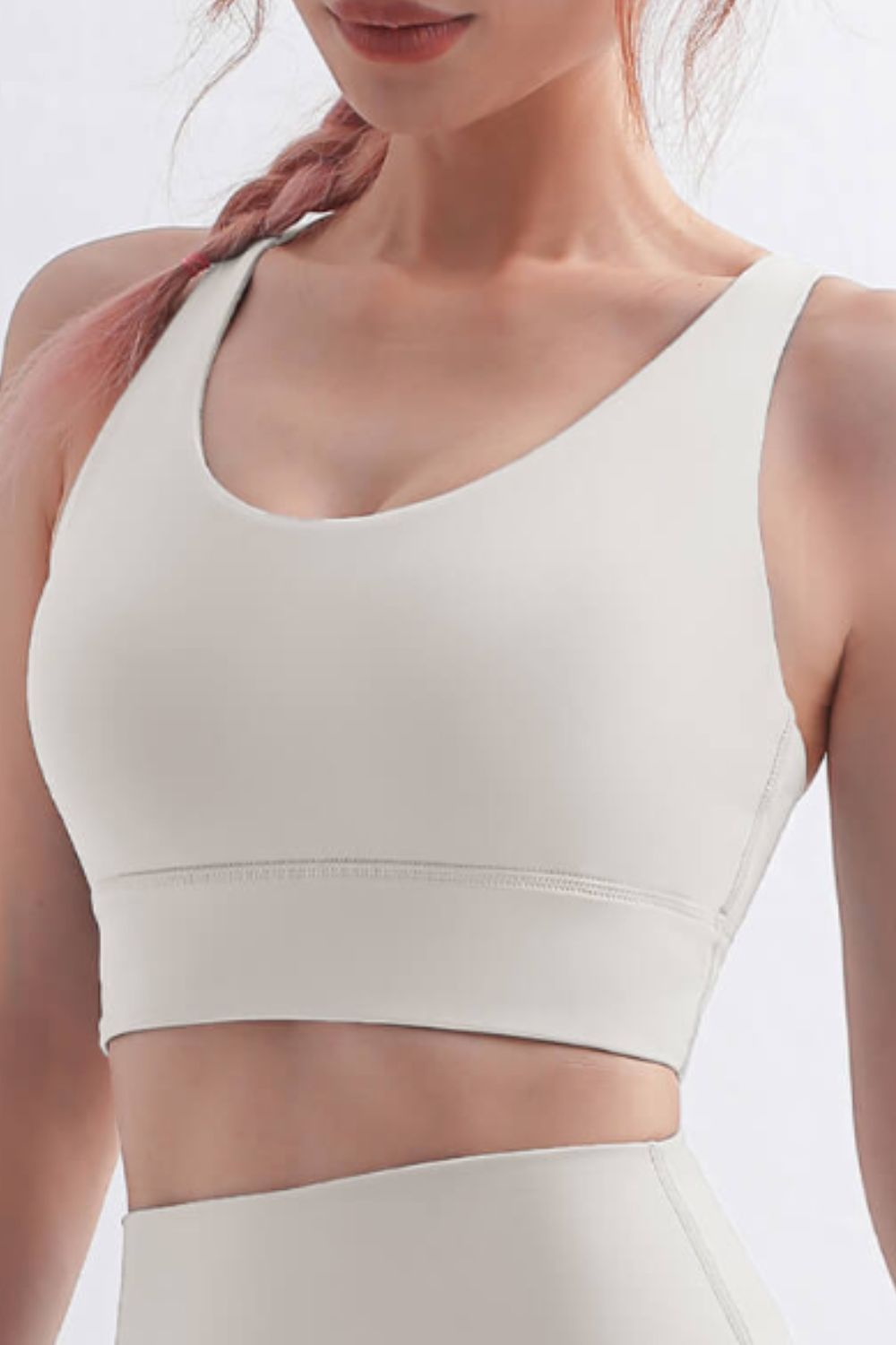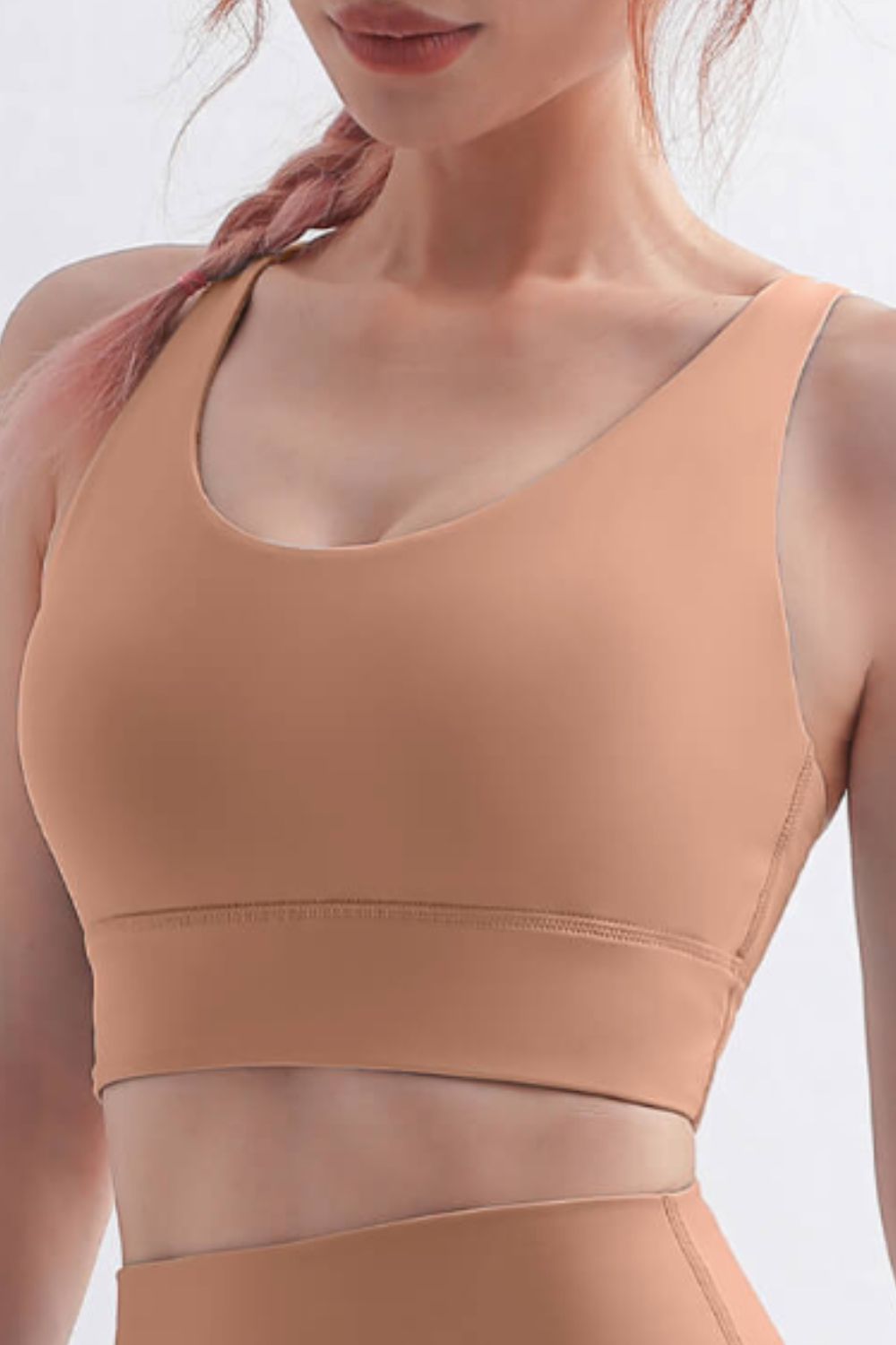Scoop Neck Crisscross Back Sports Bra in solid color, showcasing its stylish design and comfortable fit, perfect for yoga and workouts.