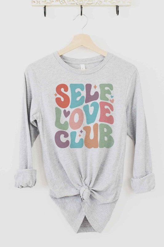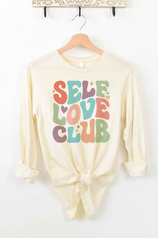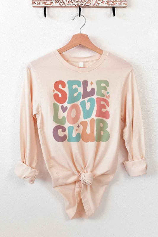 A stylish long sleeve tee featuring the words 'Self Love Club', made from premium cotton, designed for unisex fit.
