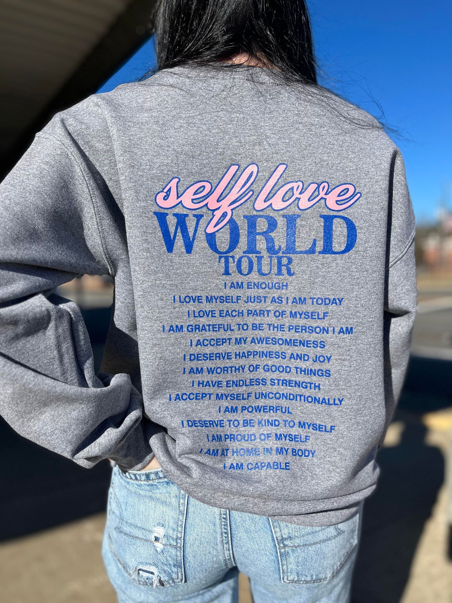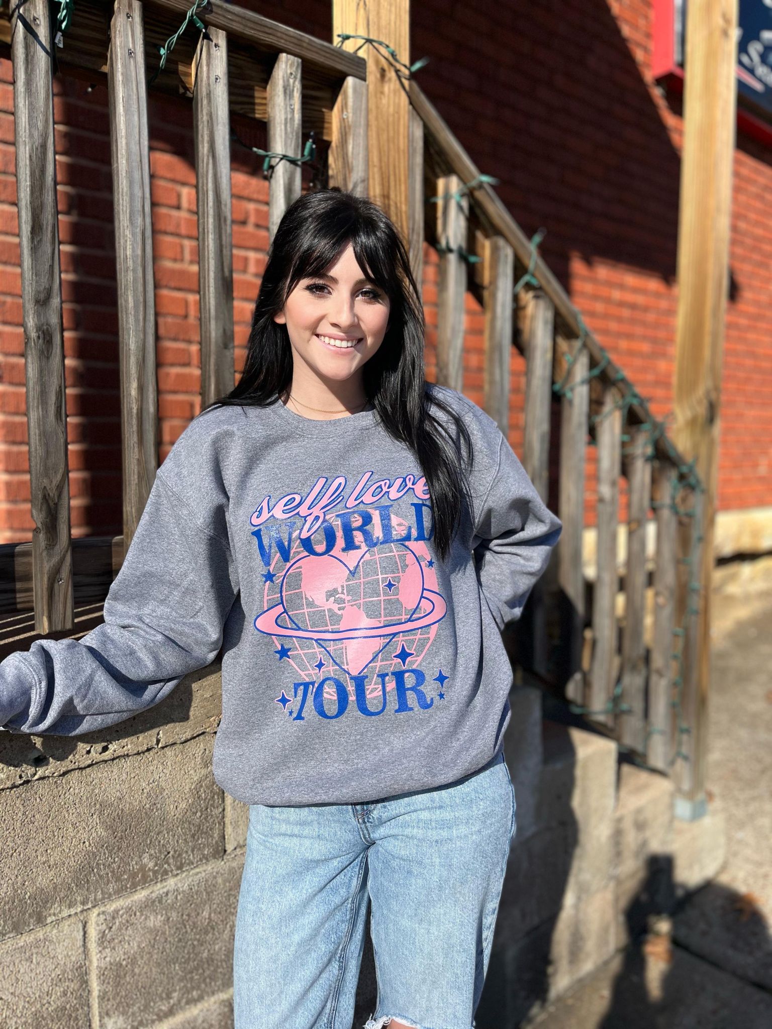 The graphite color of this tee is both trendy and versatile, allowing you to pair it with various outfits. Whether you're dressing it up with a jacket or keeping it casual with jeans, this shirt is sure to make a statement. The eye-catching graphic on the front captures the essence of the Self Love World Tour, while the sweet affirmations on the back serve as a reminder to love yourself.