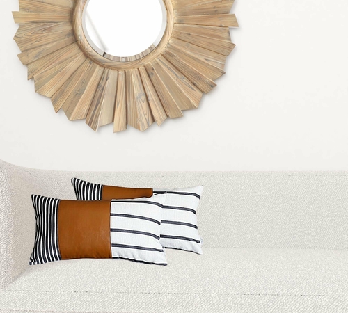 The standout feature of these lumbar pillow covers is their unique design. The covers boast a pure polyester base adorned with reverse monochromatic stripes, which beautifully flank a vibrant bright brown faux leather section in the middle. This striking combination creates a stunning visual contrast that adds depth and character to your home decor.