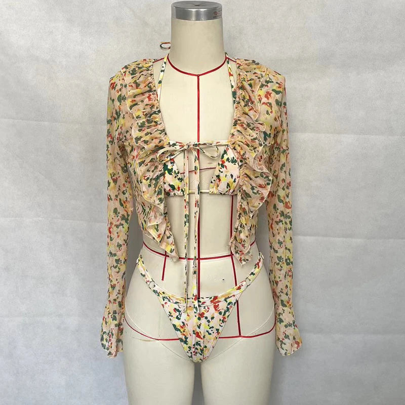 Shannon three-piece swimsuit featuring a floral print, high waist design, and wire-free support, perfect for stylish summer outings.