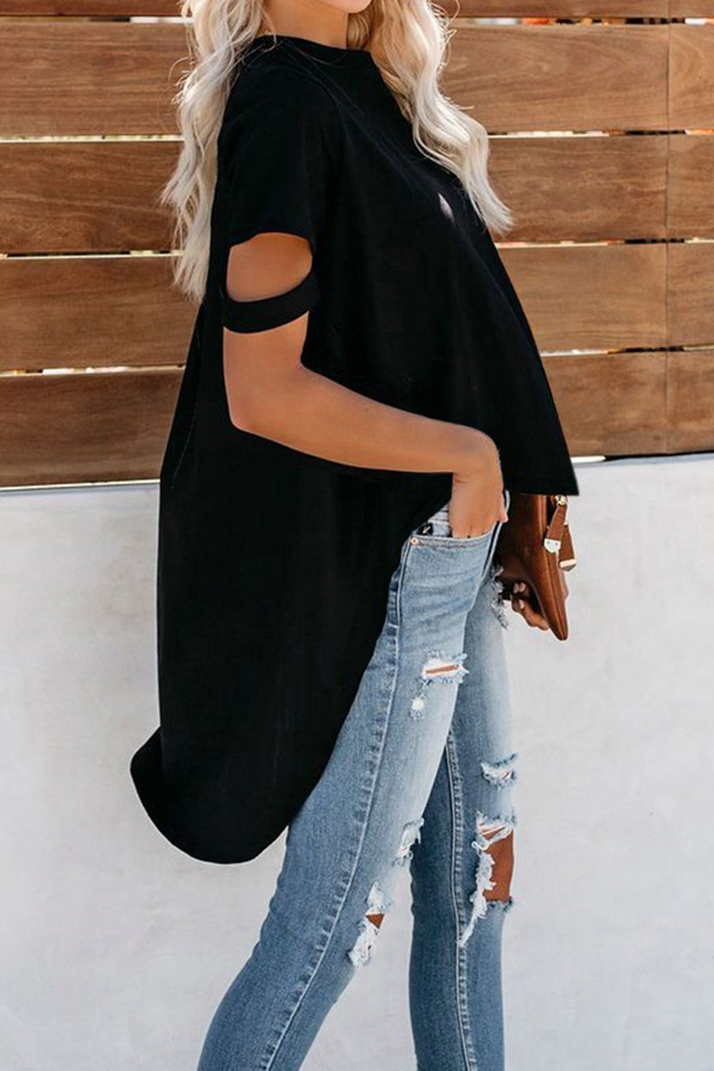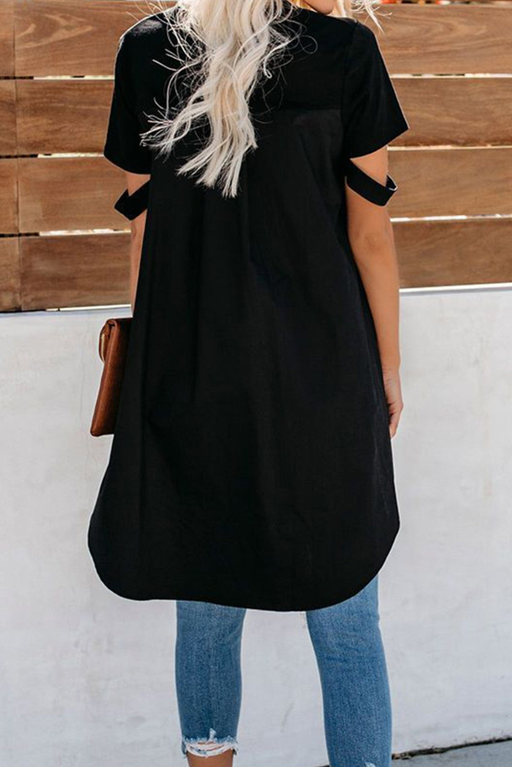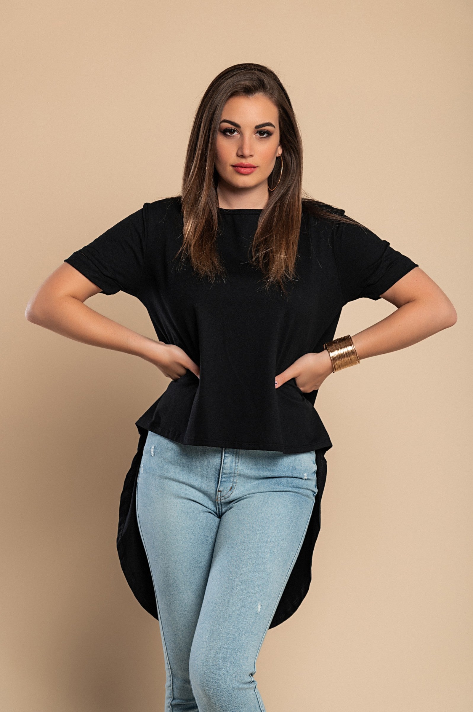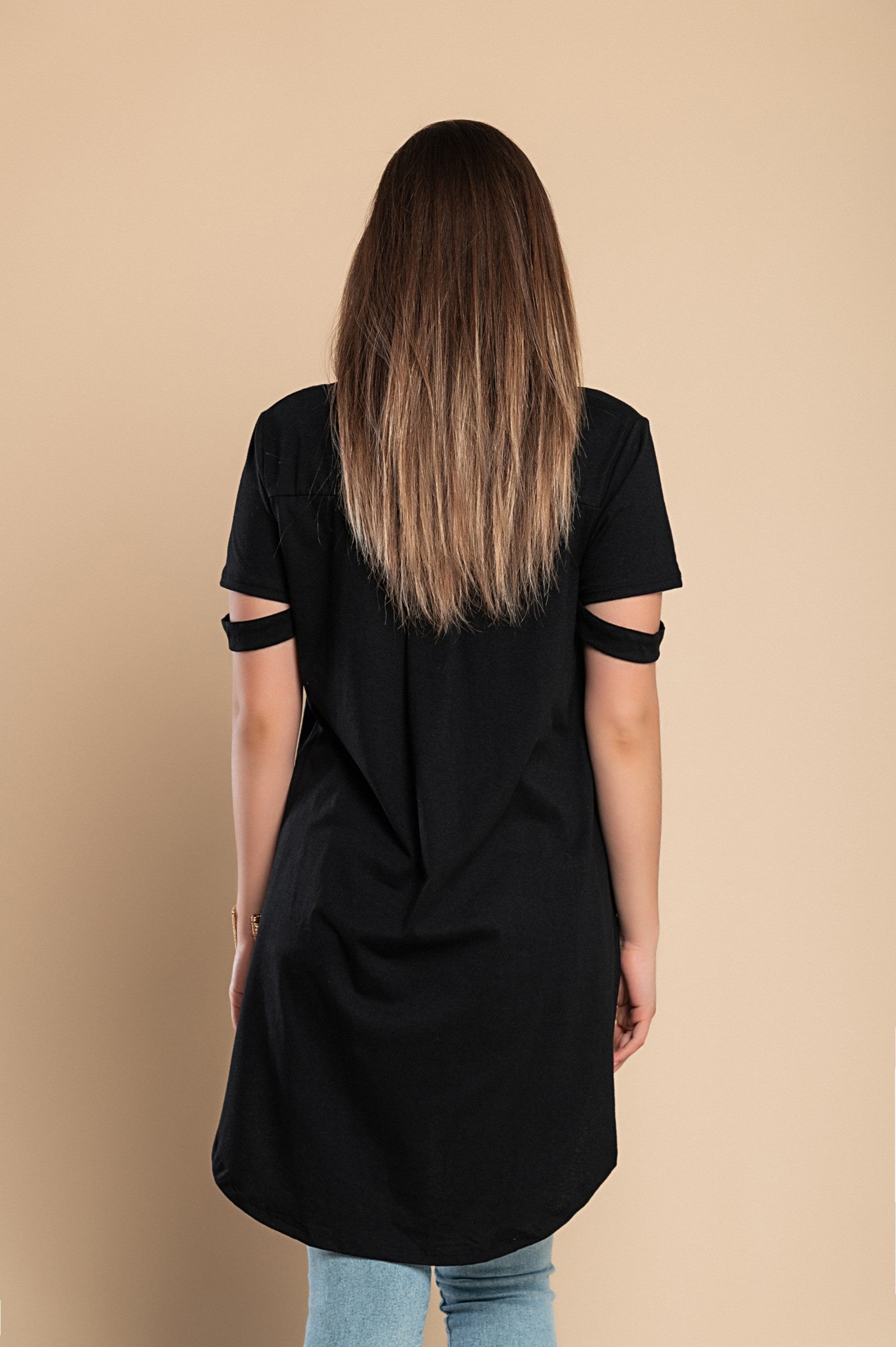 Elegant black SHIRT VEBTURA featuring a round collar and short sleeves, showcasing its asymmetric length design.