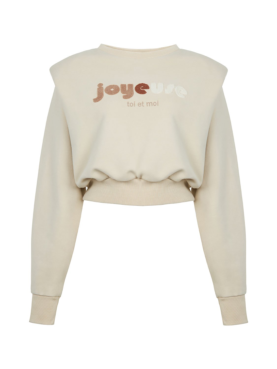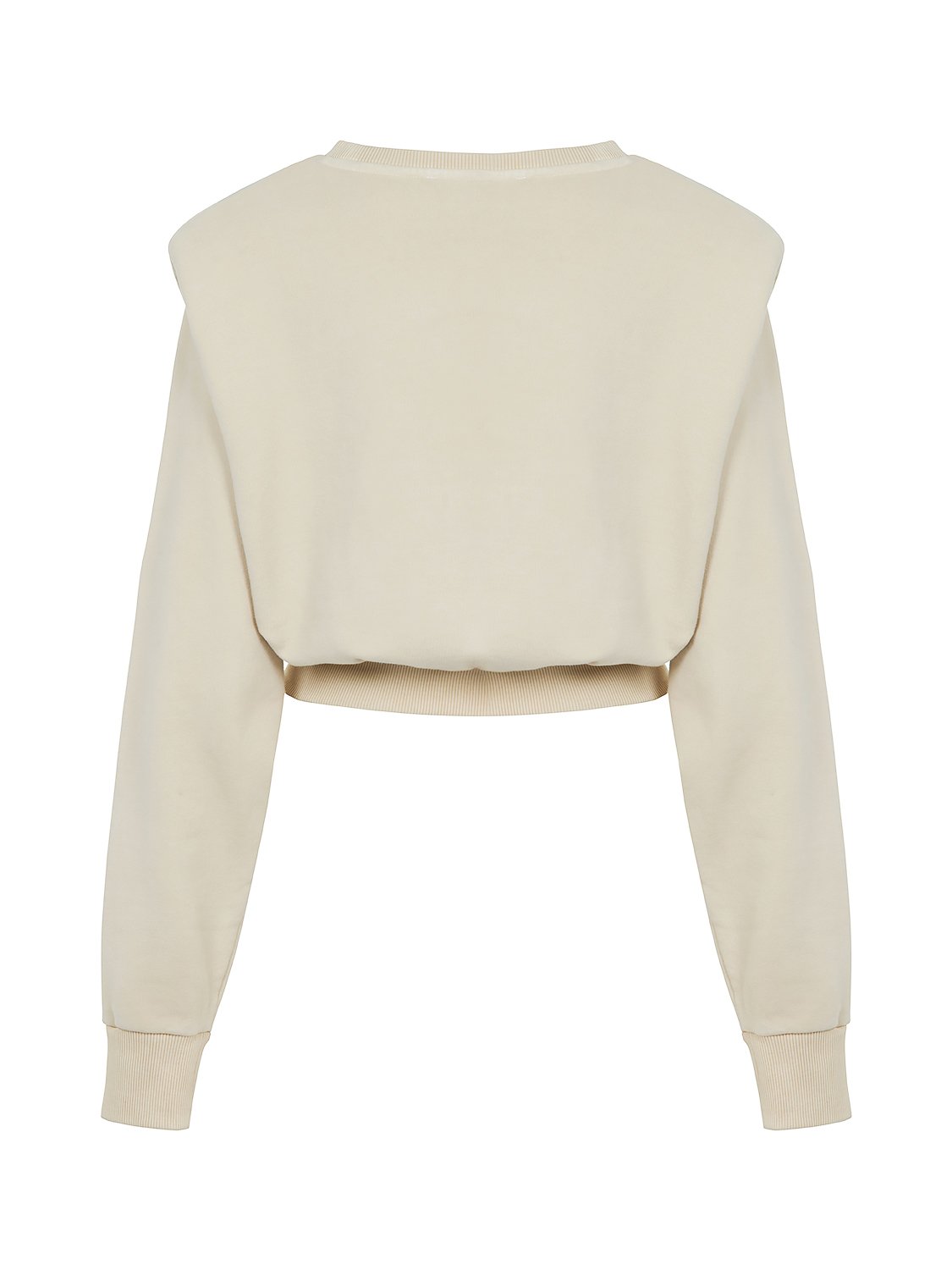 Introducing our Shoulder Pad Embroidered Sweatshirt, a perfect blend of comfort and style. This sweatshirt features a chic scoop neck and long sleeves, making it an ideal choice for both lounging at home and stepping out in style. The standout feature of this sweatshirt is the shoulder pads, which add a touch of sophistication and elevate your overall look.