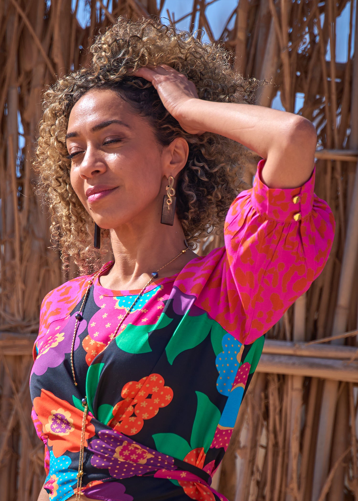 The Signature Dress features a wrap design that flatters all body types. The adjustable ties on both the skirt and top allow you to customize the fit around your waist, ensuring that you feel comfortable and confident. The combination of floral and leopard prints adds a touch of drama, making this dress a standout piece in your wardrobe.
