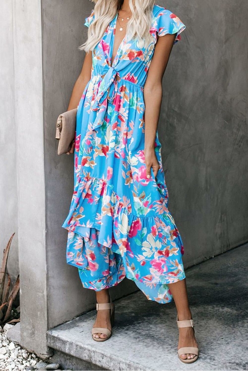 •Plunging v-neckline with a tie front bust and high low ruffle skirt