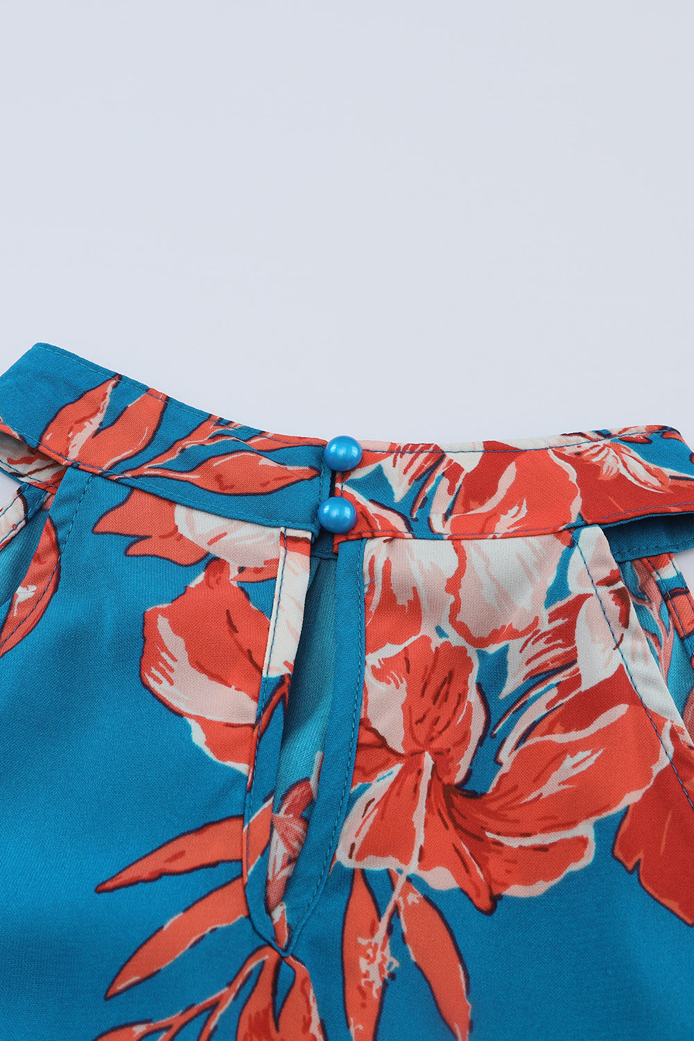 A stylish sky blue floral print sleeveless mini dress with ruffled hem, perfect for summer outings.