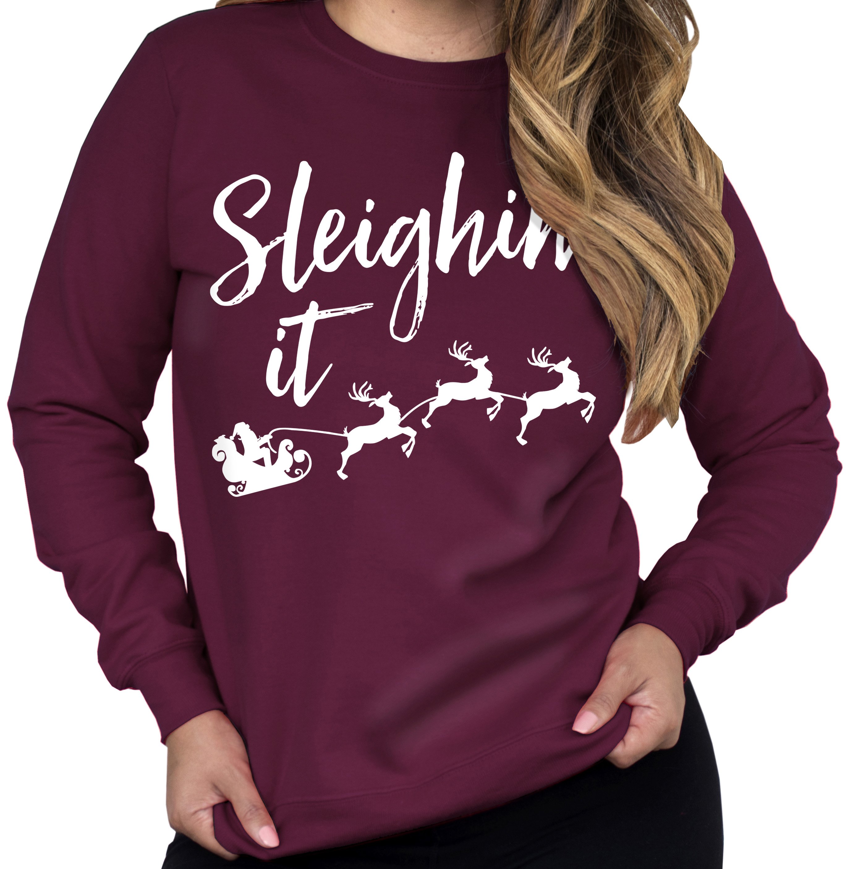The Sleighin It sweatshirt is available in three vibrant colors: red, black, and burgundy. Each color option adds a unique flair to your holiday wardrobe, allowing you to express your personal style while celebrating the season. Choose the color that best suits your festive mood!