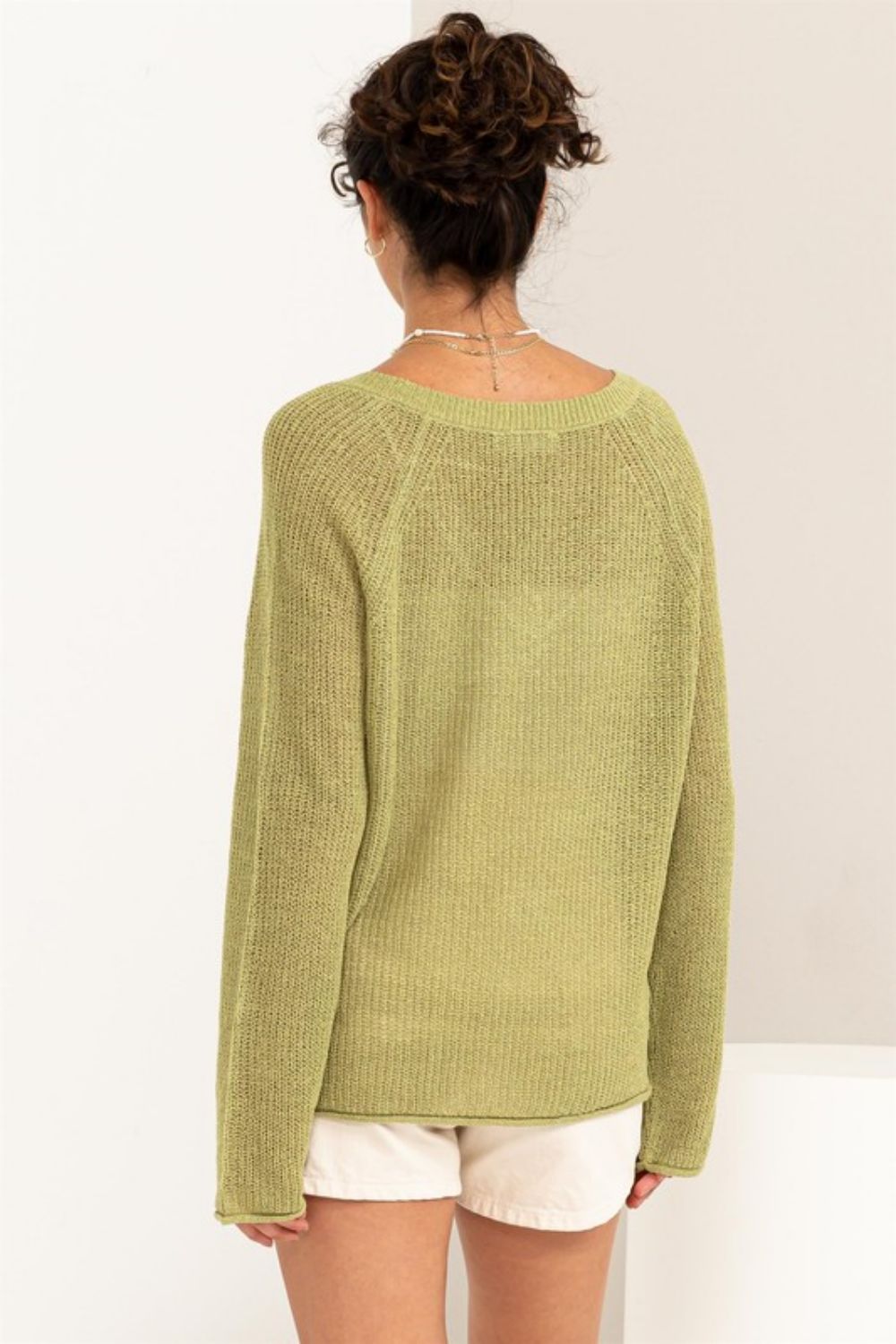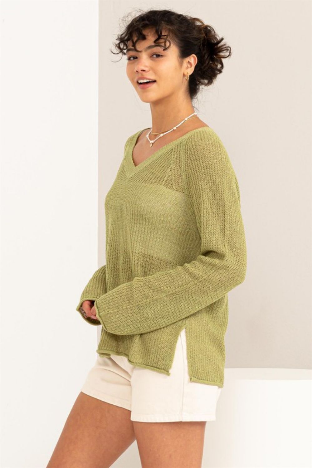 With its stylish design, comfortable fit, and easy care instructions, the Slit Rolled Hem V-Neck Knit Sweater in Pale Olive is a must-have for any fashion-forward individual. Embrace the chic and versatile nature of this sweater and make it a key piece in your wardrobe today!