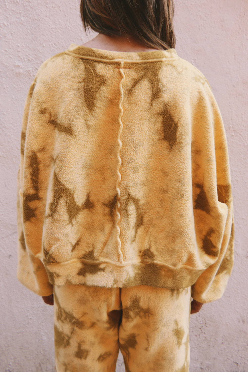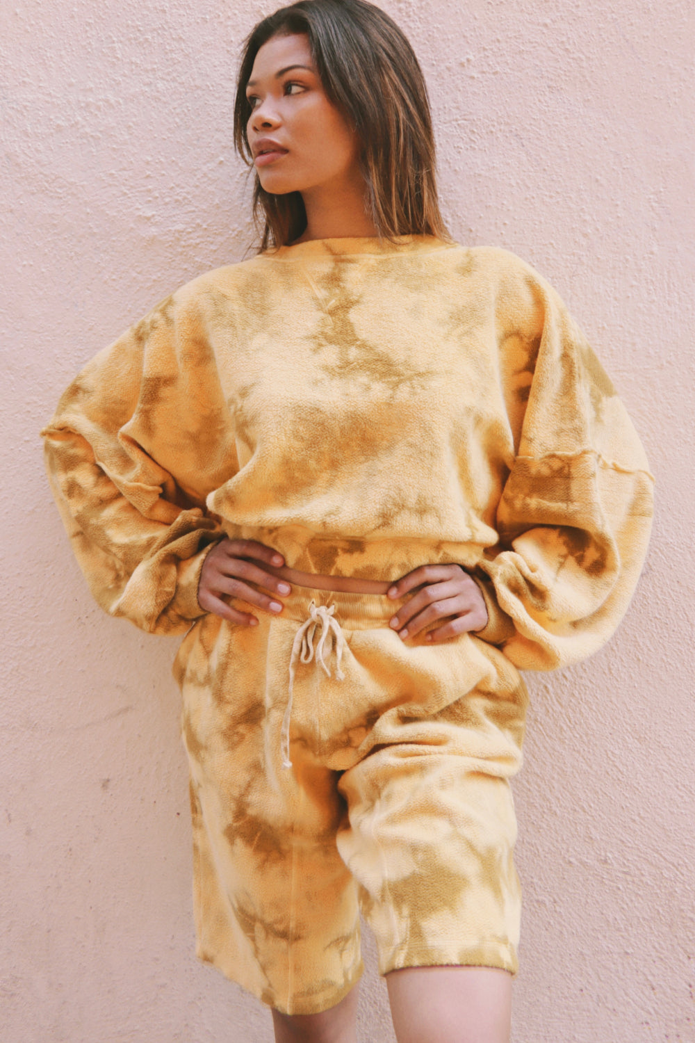 The Sophie Sweatshirt Tie-Dye is the ultimate blend of comfort and style, designed for those who appreciate a relaxed yet fashionable look. This oversized cropped sweatshirt features a unique yellow tie-dye pattern that adds a vibrant touch to your wardrobe. Made from 100% organic cotton, it not only feels great against your skin but also aligns with eco-friendly fashion choices.