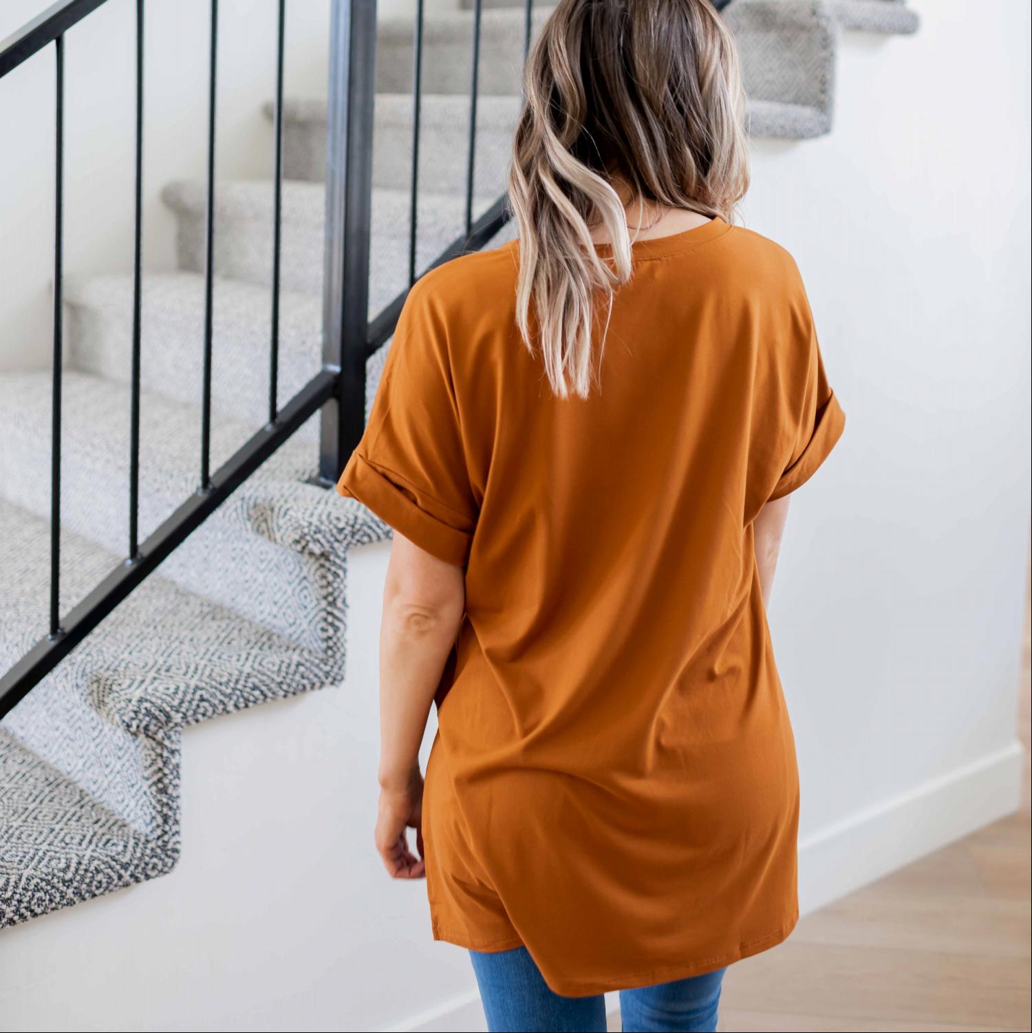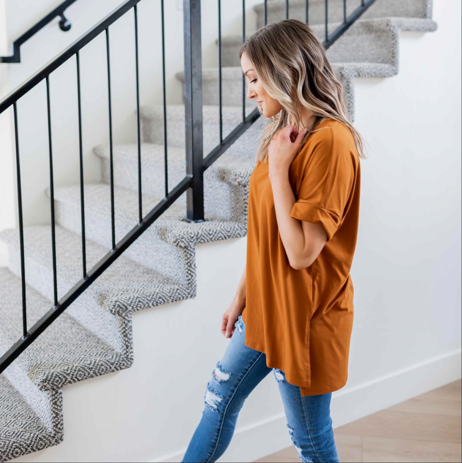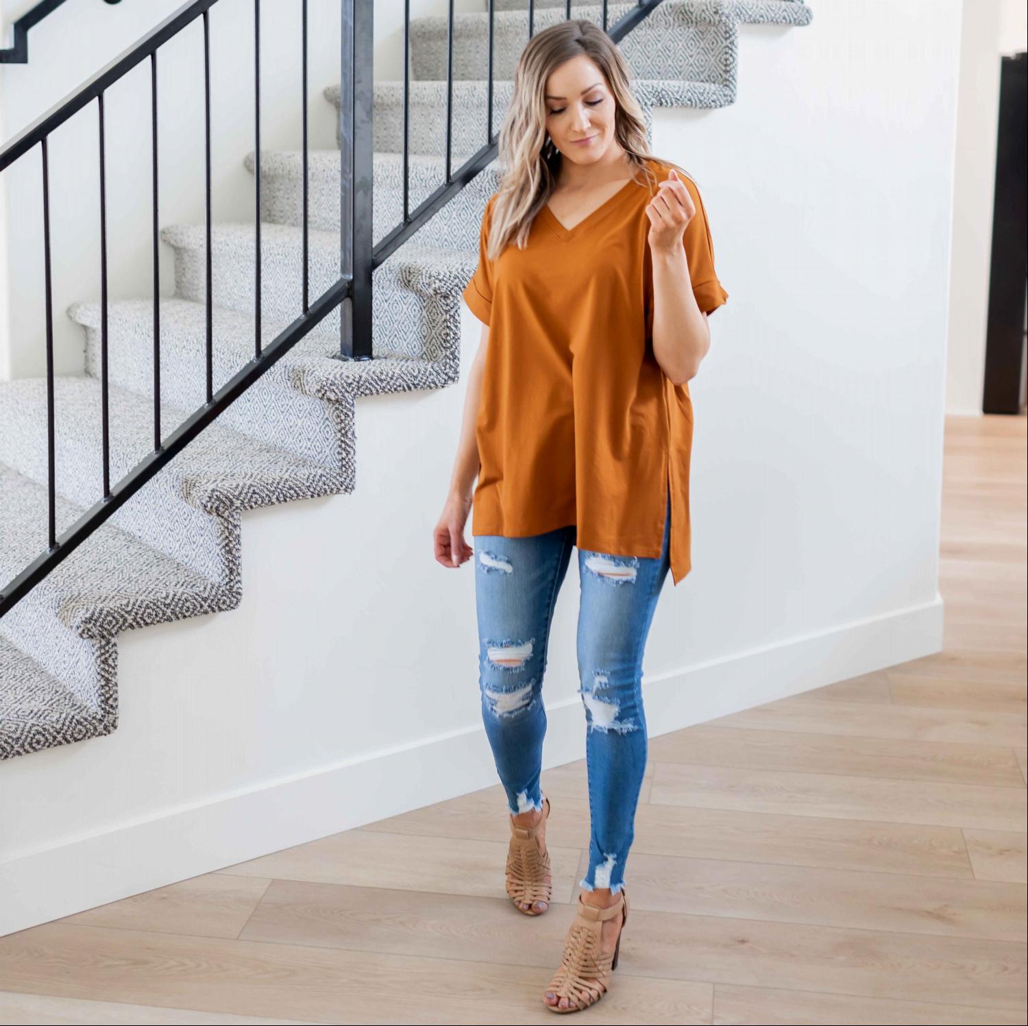 One of the standout features of the Sporty V-Neck Tee is its versatility. You can easily dress it up or down depending on the occasion. Pair it with cute flats for a casual lunch date or slip on some tennis shoes for a day of running errands. The options are endless, making it a staple piece in your wardrobe.