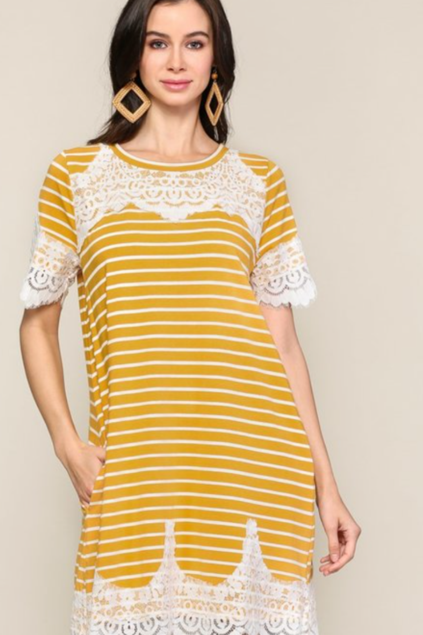 When it comes to sizing, the Striped Round Neck Lace Detail Mustard Dress runs true to size. This means you can confidently select your usual size without worrying about fit issues. The dress is designed to flatter your figure while providing a comfortable fit that you can rely on.