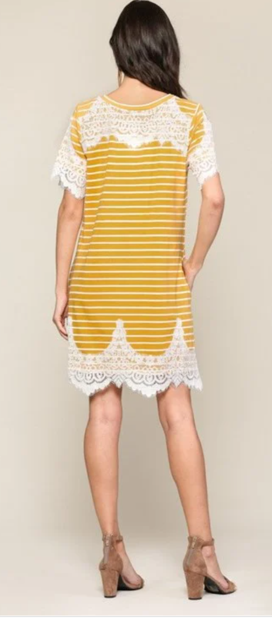Introducing the Striped Round Neck Lace Detail Mustard Dress, a stunning addition to your wardrobe that combines elegance with comfort. This dress features a unique striped pattern that adds a touch of sophistication, while the intricate lace detailing at the front and back elevates its overall appeal. Whether you're heading out for a casual brunch or a special evening event, this dress is versatile enough to suit any occasion.