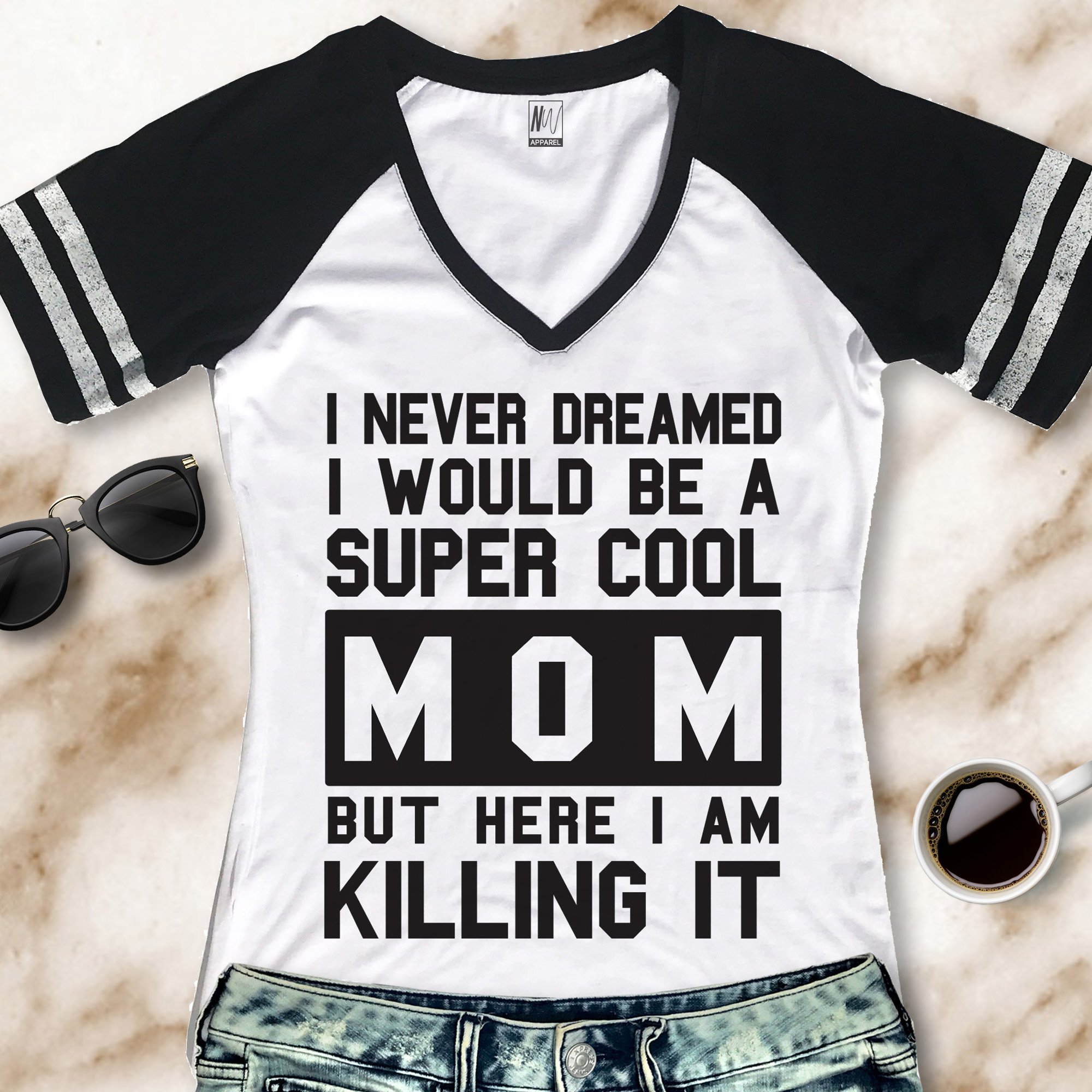Introducing the SUPER COOL MOM V-Neck Shirt, a perfect blend of style and comfort for all the amazing mothers out there. This shirt features the empowering phrase, "I NEVER DREAMED I WOULD BE A SUPER COOL MOM, BUT HERE I AM KILLING IT," making it a fantastic choice for moms who want to express their pride and joy in motherhood. Whether you're running errands, attending a casual gathering, or simply lounging at home, this shirt is designed to keep you looking chic and feeling comfortable.