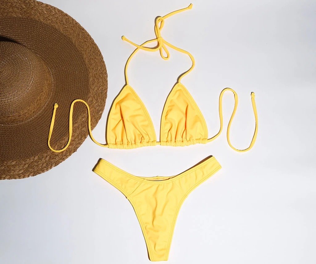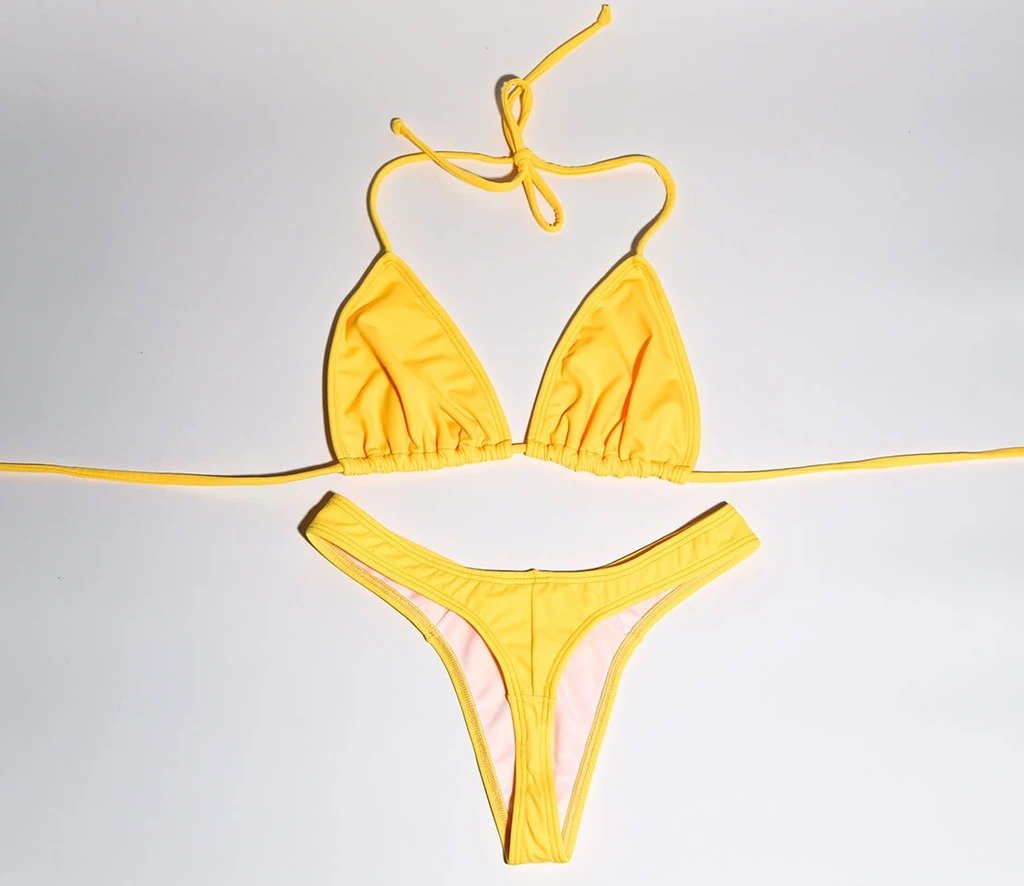 A stylish two-piece set featuring adjustable side strings, designed to accentuate curves, made from a blend of Lycra and Spandex.