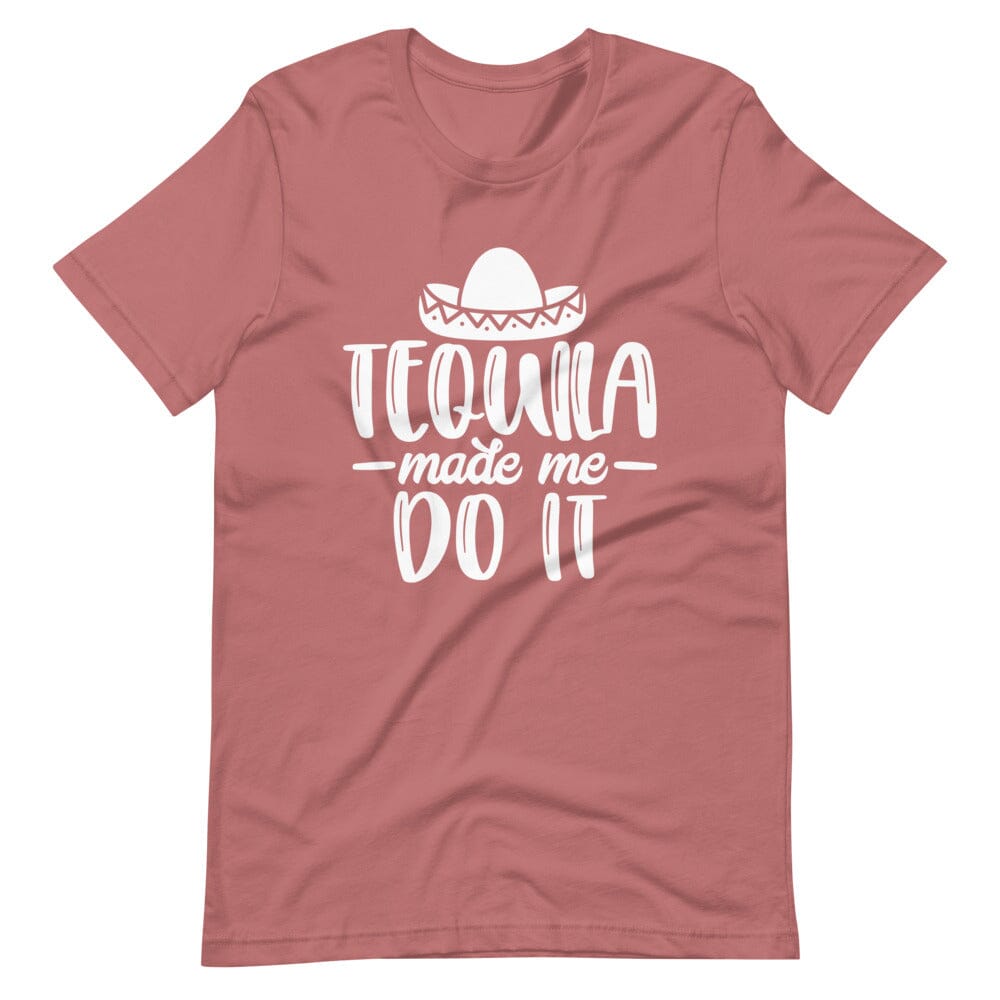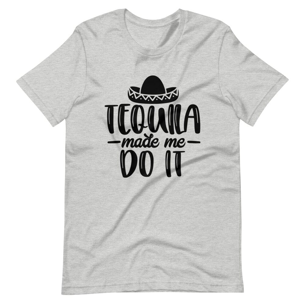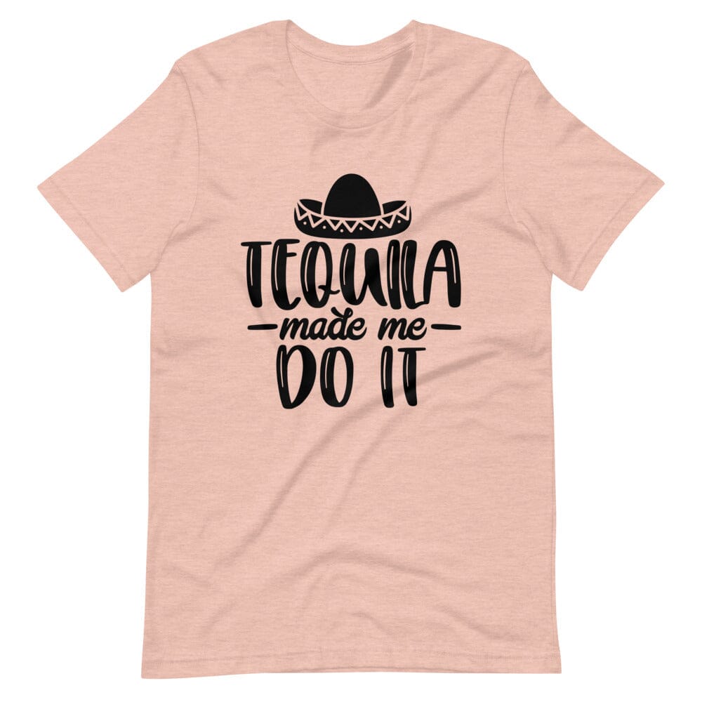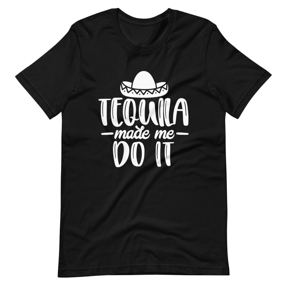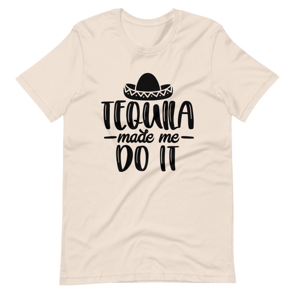 A stylish unisex t-shirt featuring the phrase 'Tequila Made Me Do It' in a fun font, made from soft ringspun cotton.