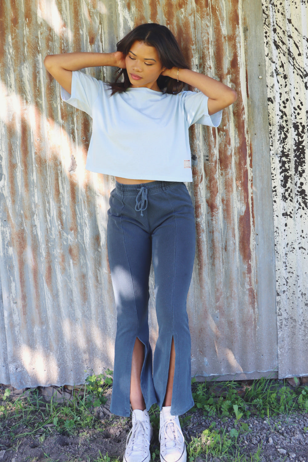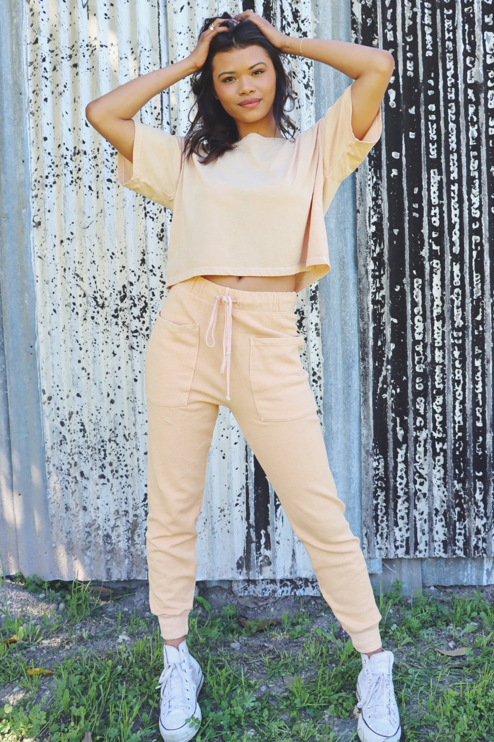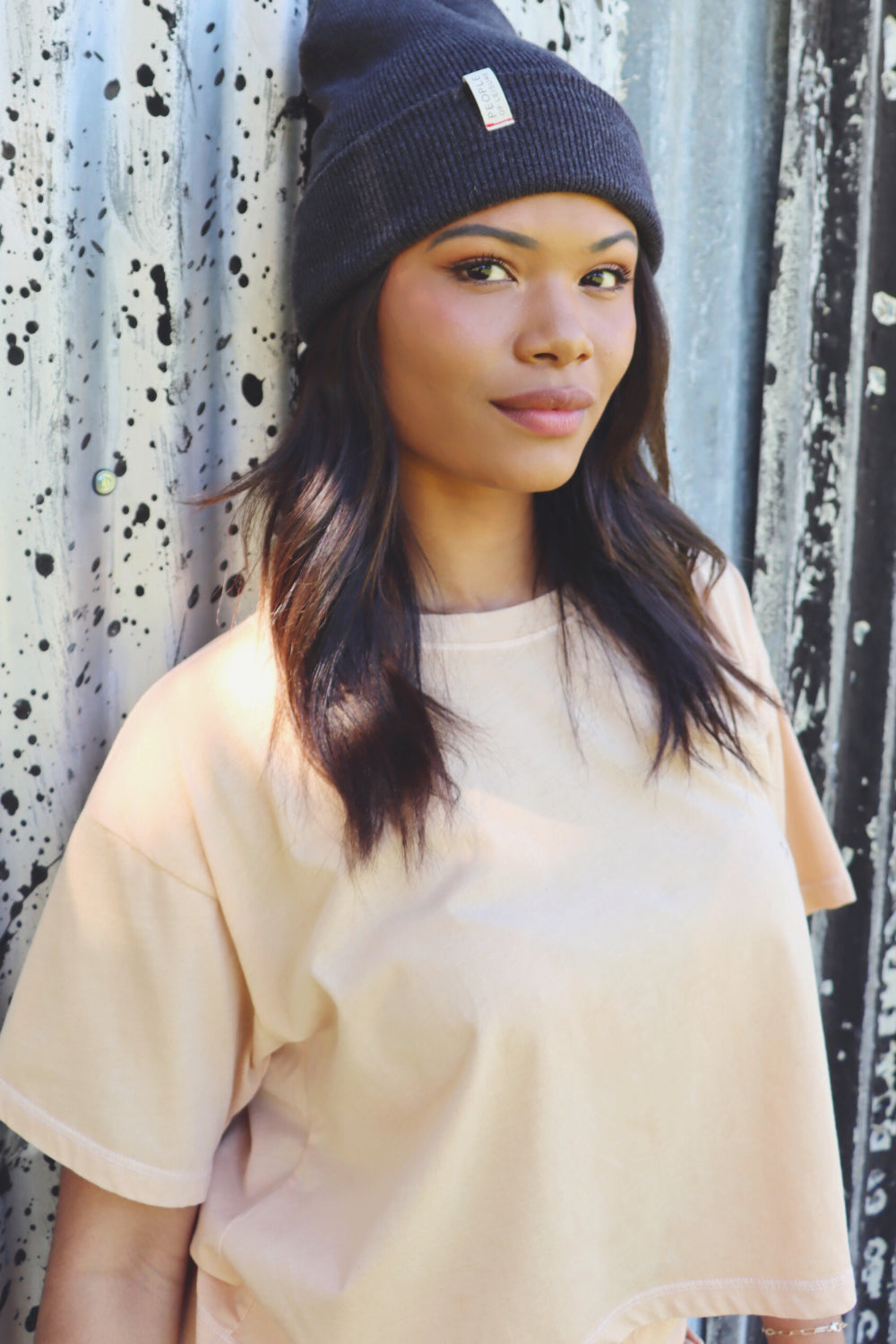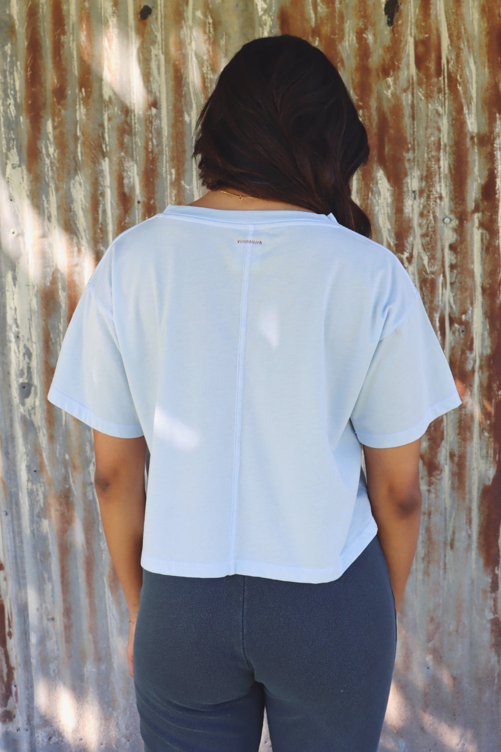 With its boxy cropped fit, the Awaken Tee flatters all body types while providing a relaxed and comfortable feel. The carefree silhouette allows for easy pairing with high-waisted jeans, skirts, or shorts, making it a staple piece for any fashion-forward individual. Available in two stunning colors, Sky Blue and Apricot, this tee is perfect for adding a pop of color to your wardrobe.