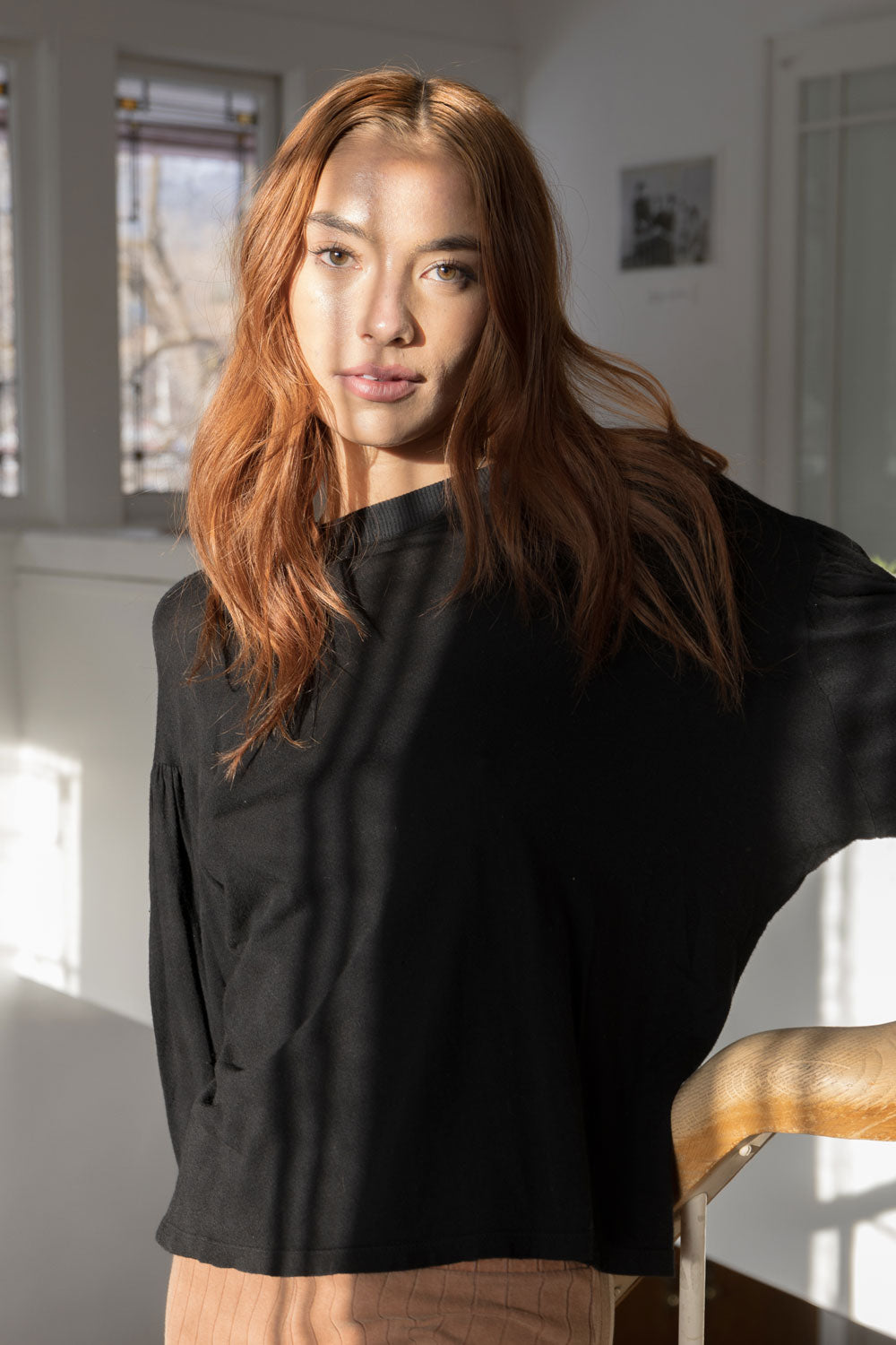 The Blair Top in black, showcasing its luxurious fabric and stylish silhouette, perfect for high fashion and athleisure.