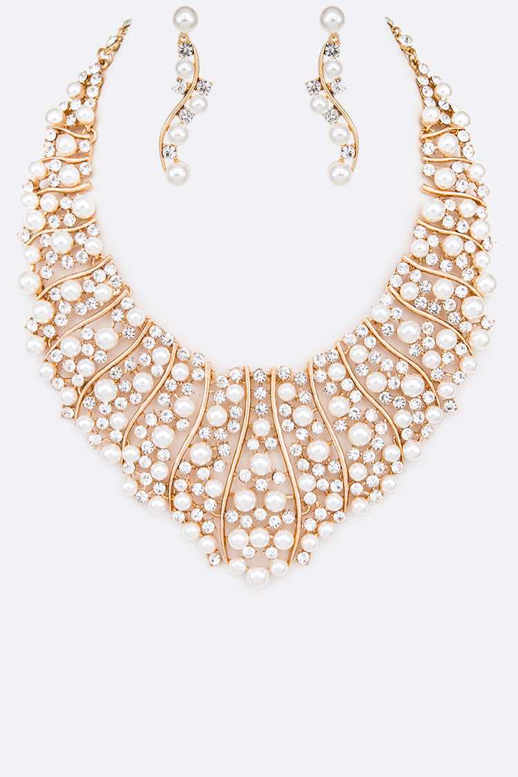 The Deni Statement Piece featuring a 20" necklace and 4" drop earrings, elegantly displayed on a soft fabric background.