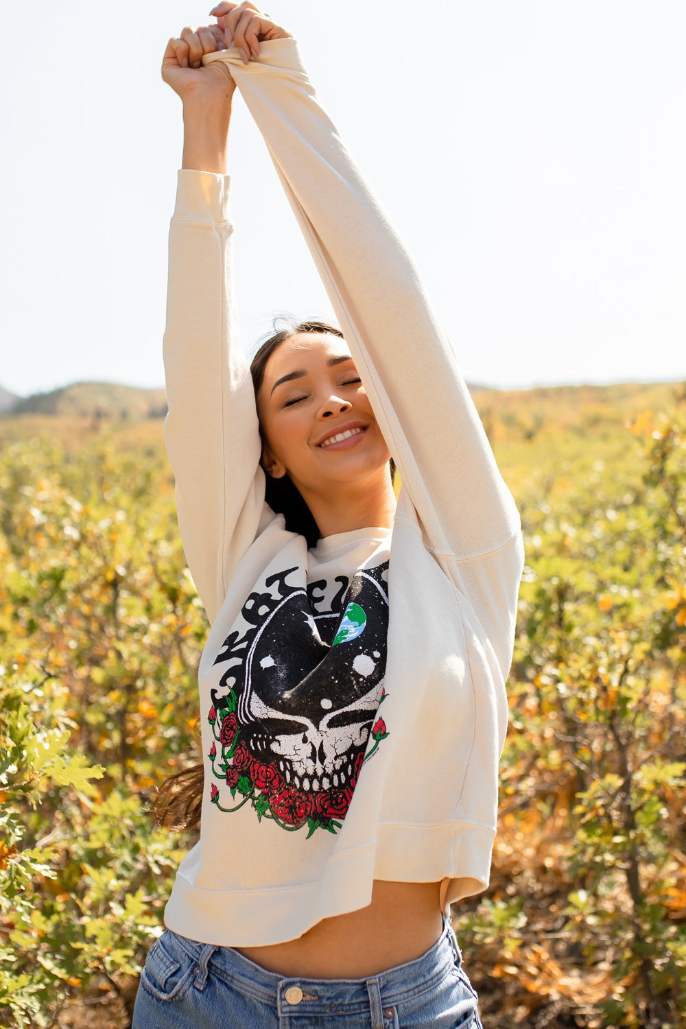 Introducing the Grateful Dead Sweatshirt in White, a perfect blend of style, comfort, and sustainability. This sweatshirt is designed for fans of the iconic band who want to showcase their love while staying eco-conscious. Made from 100% organic cotton, this sweatshirt not only feels great against your skin but also supports environmentally friendly practices.