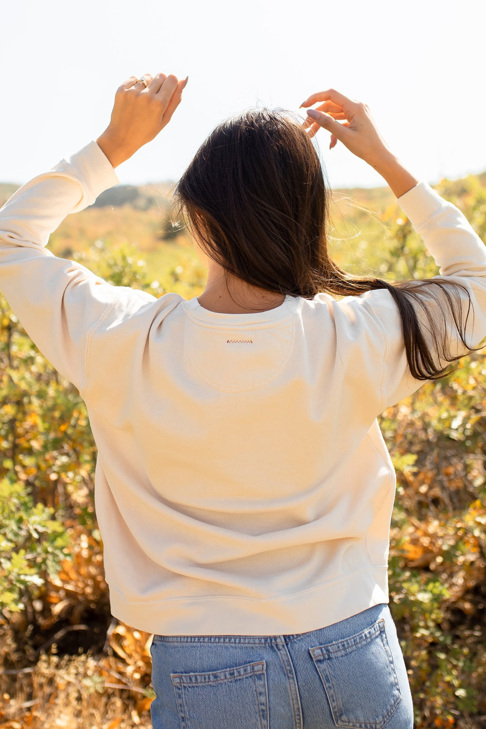 Available in sizes Small to Extra Large, this sweatshirt caters to a wide range of body types, ensuring that everyone can enjoy its comfort and style. The model in the image is wearing a size Small, showcasing the flattering fit that this sweatshirt offers.